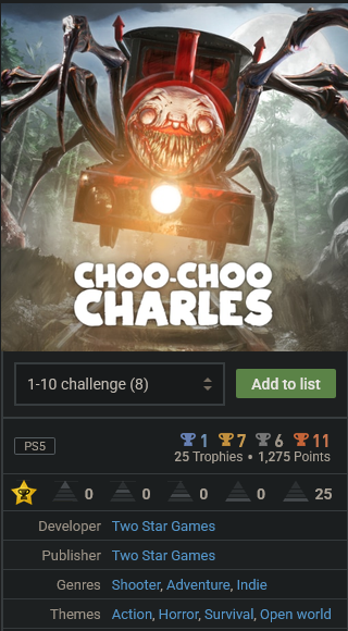aAlle Einsteigen oder wegrennen Bei Choo Choo Charles Bei Choo Choo Charles ist man imme rnur nachts unterwegs und man muss teilweise auch um gegner rumschleichen um an sein ziel zu kommen. ähm so am rande, ich glaube hier wird eher nach Theme gesucht, als genre führt psnp keine horror Kategorie