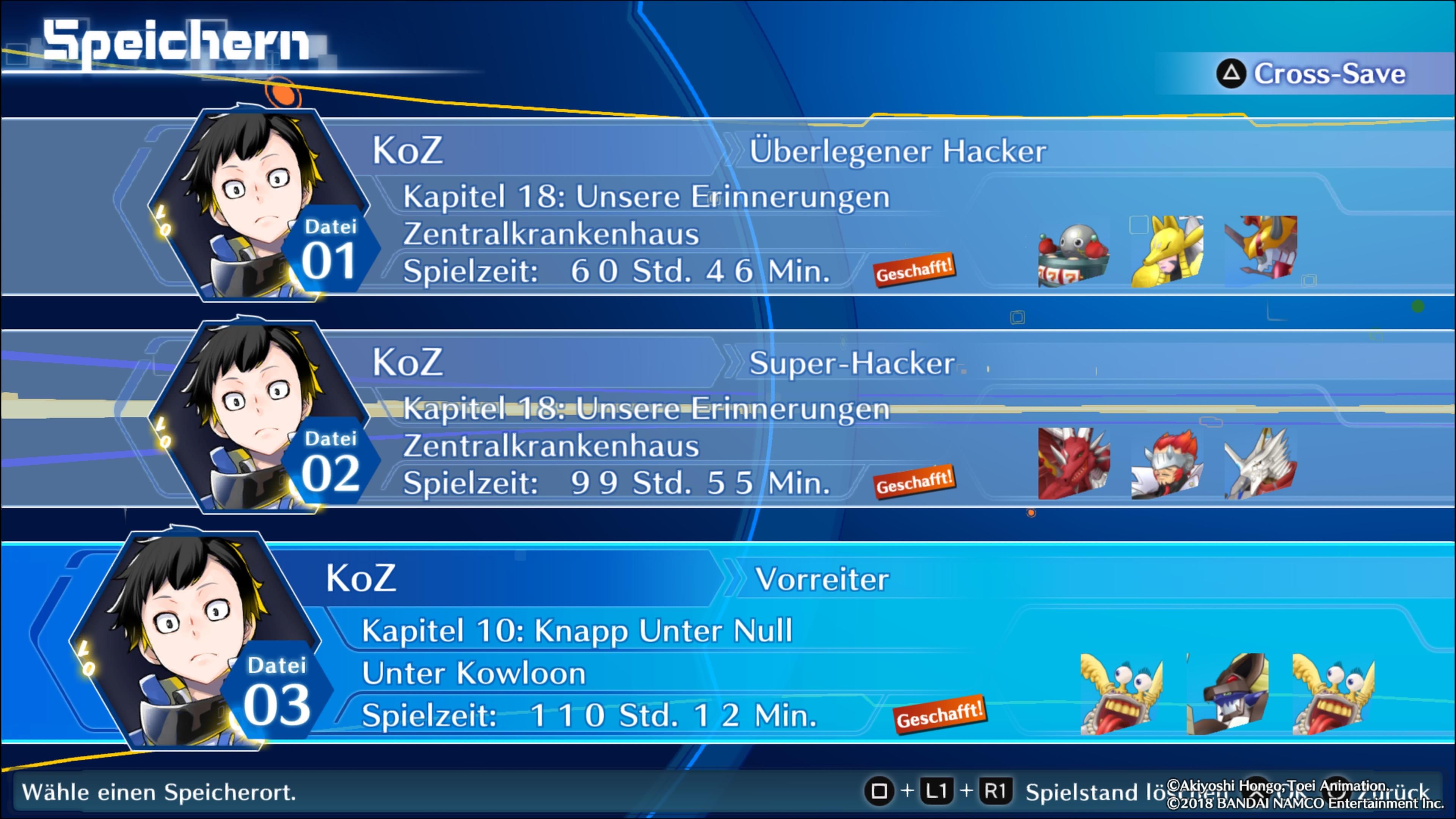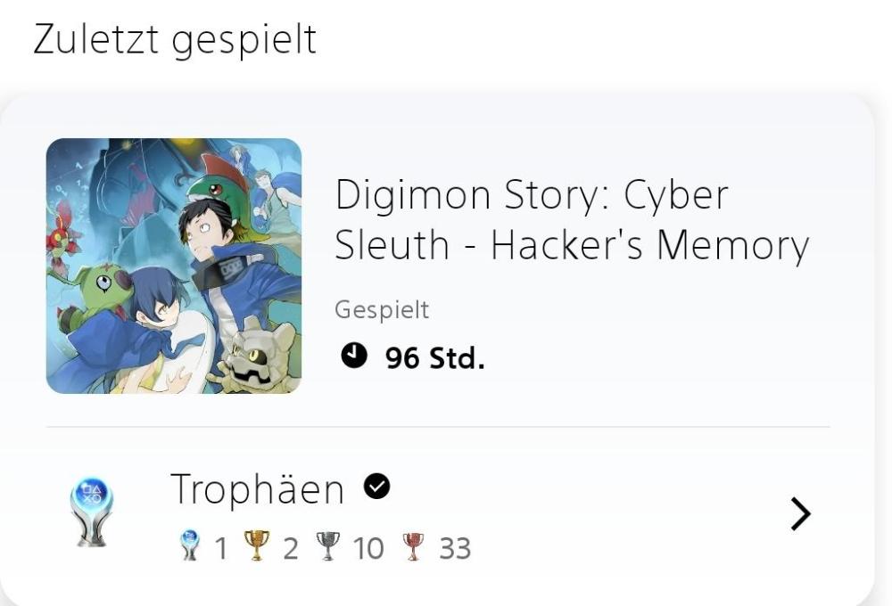 Ich habe irgendwas zwischen 96 und 110 h gebraucht. (Also Vote für 81-120 h). Da das Spiel im Hintergrund weiterläuft (was maximal für die Digi-Farm relevant ist, mir aber keinen nennenswerten Vorteil gebracht hat), weichen ingame und Menüanzeige bei mir stark voneinander ab (siehe Anhang). Ich habe Cyber Sleuth nicht gespielt und konnte damit nichts daraus übernehmen. Für das Beenden der Story habe ich ca. 60 h gebraucht (davon ca. 10 h die oben erwähnte AFK-Zeit). Danach habe ich 24(!) Stunden nur für die Medaillen gebraucht. Hätte ich zuerst den Abyss-Server erledigt, wäre das Ganze wohl deutlich schneller gewesen. Dann habe ich noch ca. 16 h trainiert um den Digidex zu füllen, die vier trophäenrelevanten Digimon zu digitieren und einfach ein paar auf Level 99 zu bringen. Dazu kommen dann noch die letzten beiden Cups und der Abyss-Server. Nach diesen 100 h (inkl. AFK-Zeit) hat mir dann nur noch der höchste Hackerrang gefehlt. Also noch einmal knapp 10 h ins NG+ gesteckt, um Platin zu bekommen. -
