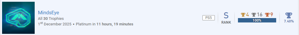 Platin #60 war jetzt Mindseye und um ehrlich zu sein mochte ich das Game sogar. Es ist nicht wie anfangs irgendwie mal angesprochen wurde eine Konkurrenz für GTA. Aber als linearer Shooter für 20€ bei der Disc Version (ich hab 30 gezahlt) kann ich es echt empfehlen. Außerdem eine schön schnelle Platin. -