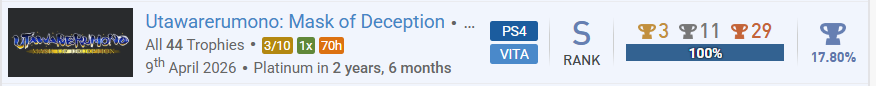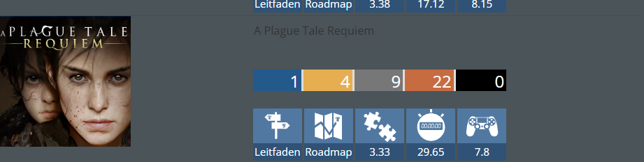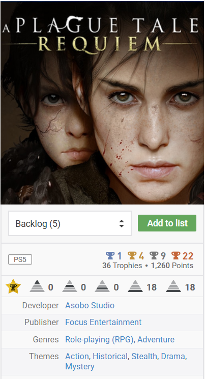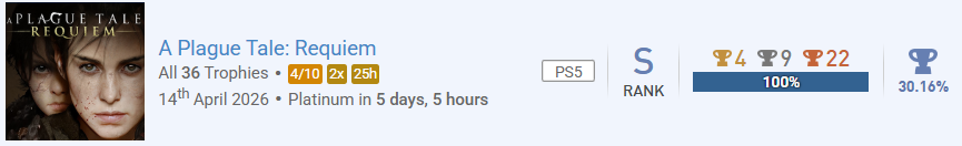 2. A Plague Tale: Requiem Schlage einem Mitspieler ein Spiel vor, das ihr beide im Event beendet. Erspiele eine Trophäe, deren Name oder Bild etwas mit Herstellung, Bauen, Reparatur oder Verbesserung zu tun hat. Erspiele eine Trophäe, deren Name oder Bild etwas mit Heimlichkeit, Verteidigung, Schutz oder Vorsicht zu tun hat. Komplettiere ein neues Spiel mit einer Komplettierungsrate von 25,00 - 74,99 %. Komplettiere ein neues Spiel mit einer Schwierigkeit von 1,00 - 3,99. Komplettiere ein neues Spiel mit einer Spielzeit von 25,00 - 49,99 Stunden. Komplettiere ein neues oder Backlog-Spiel, in dem du ein "dunkles" Geheimnis aufdeckst oder ein Ritual/Fluch brichst. Komplettiere ein neues Spiel aus dem Genre/Theme "Horror" oder "Mystery". Utawarerumono: Mask of Deception Komplettiere ein Backlog-Spiel mit einer Komplettierungsrate von 5,00 - 24,99 %. Komplettiere ein Backlog-Spiel mit einer Schwierigkeit von 1,00 - 3,99. Komplettiere ein Backlog-Spiel, das im Jahr 2023 oder früher gestartet und bis Eventbeginn nicht beendet wurde.
