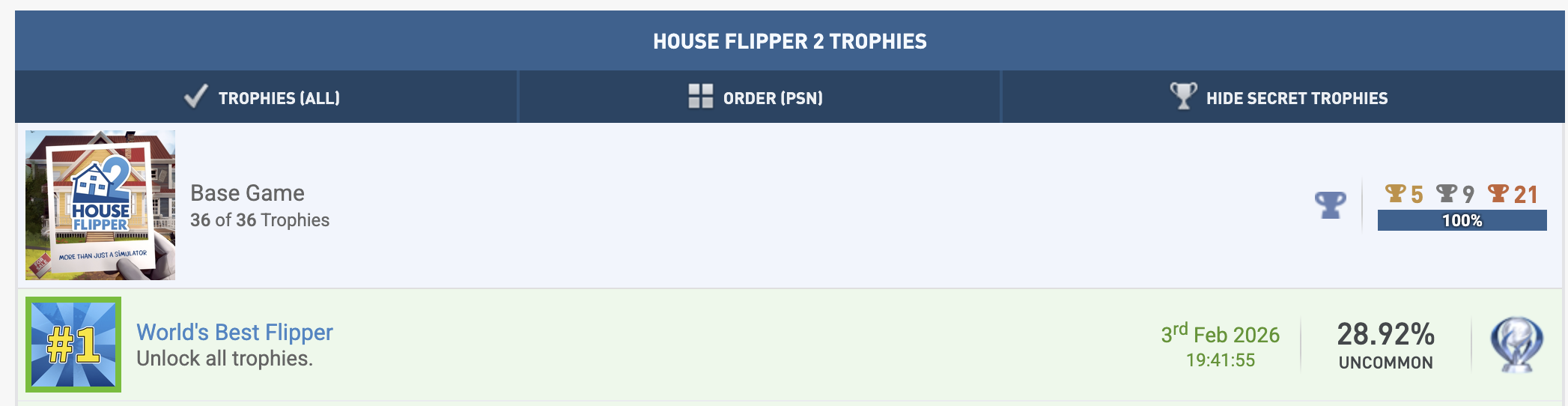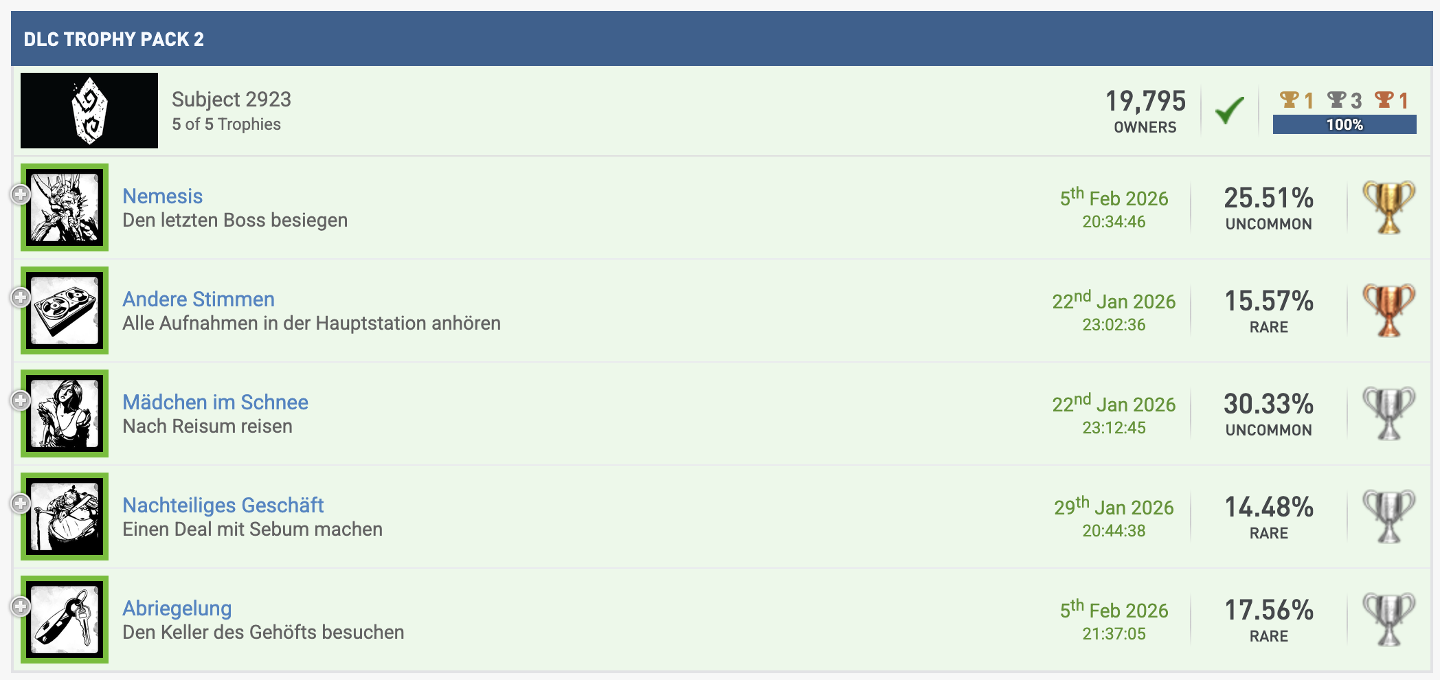 Remnant: From the Ashes (Release 2019) House Flipper 2 Wenn Tiere reichen nehme ich diese Trophäe mit den Pferden aus dem Awaji DLC von AC Shadows Und da ich die vergessen habe, für Clair Obscur Expedition 33 noch: Zeitaufwand: Durchschnittsbewertung: 71.24