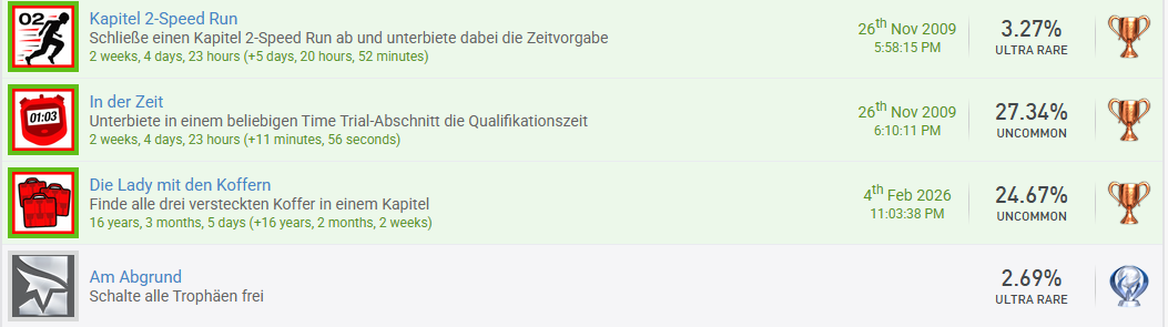 1x in Mirror's Edge Wieso so einen alten Schinken ausgegraben? Für die Bronze #3003 und wollte ein Trophäe, die irgendwas mit einer 3 zu tun hat. Musste für diese 3 Koffer aufsammeln Einfach mal über 16 Jahre nach der letzten Trophäe dort und die hatte auch noch mit Speedrun zu tun... -