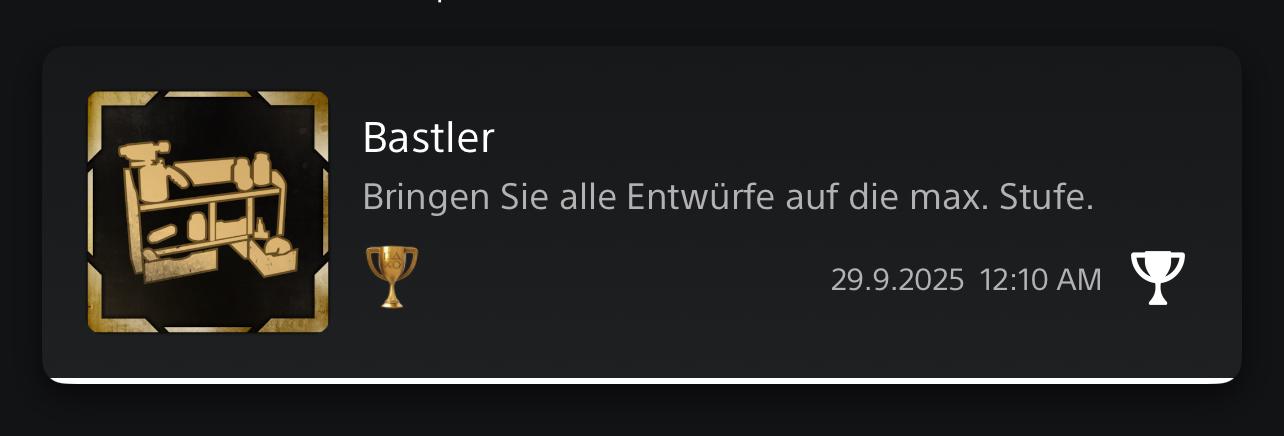es ist NICHT notwendig alle Entwürfe zu verbessern! nachfolgende Entwürfe waren bei mir nicht verbessert und habe die Trophäen trotzdem bekommen - Blendgranate - Blutmesser - Gasgranate - Tennisschläger - EPcalibur 2 - Strauss & Broda Machete - Umgeschmiedeter Handschar - Schaftmod - Inferno - Biberstock HIER auch als Kurzvideo wo man es sieht das bei mir nicht alle Entwürfe verbessert sind -