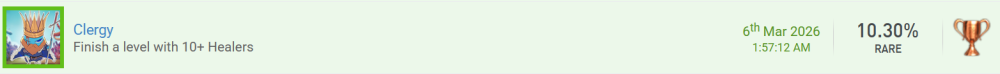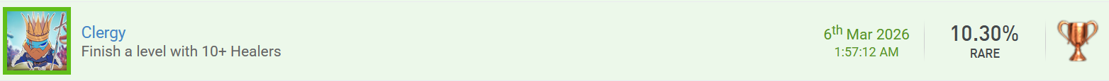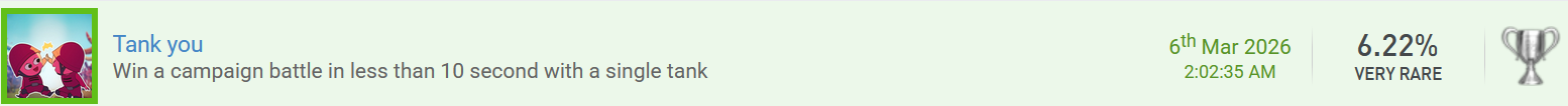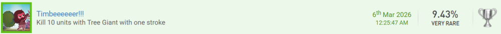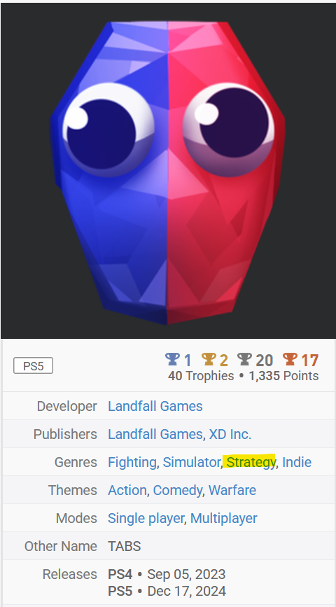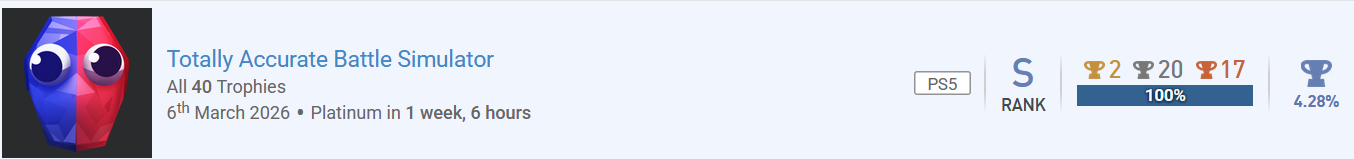 Huhu! Ich melde "TABS - Totally Accurate Battle Simulator" fertig, und damit auch ein paar Forentrophäen. Erspiele eine Trophäe, die einen Wortwitz enthält. 2x würde ich die gerne mit den folgenden Trophäen mitnehmen - ich glaube sie sind selbsterklärend. Mache einen Screenshot von einem ungewöhnlichen oder witzigen Fundstück. Die letzte Kuriosität für dieses Event haben wir auch wieder, nämlich mit der Schubkarren-Kampfeinheit. Da sitzen 3 Dullies drauf und sie fahren damit wie wahnsinnig herum und geben auch total viel Schaden. Für den Eigengebrauch bei den Camptrophäen: Erspiele eine Trophäe, deren Name oder Bild etwas mit Heilung, Medizin, Regeneration oder ähnlichem zu tun hat. Auf dem Trophäenbild ist die Heiler-Einheit abgebildet und auch die Beschreibung fordert, dass man ein Level abschließt, in dem man 10 Heiler auf dem Feld hat! Erspiele eine Trophäe, deren Name oder Bild etwas mit Herstellung, Bauen, Reparatur oder Verbesserung zu tun hat. "Timber" steht für Holz, und auf Deutsch heißt die Trophäe sogar "Baum fääääällt!" - Holz braucht man doch immer für das Heimwerken im Camp. Erspiele eine Trophäe, deren Name oder Bild etwas mit Transport, Lagerung, Optimierung oder ähnlichem zu tun hat. Und für die Logistik haben wir einen Karren im Trophäentitel, auf dem sich Pfeile befinden! Komplettiere ein neues Spiel mit einer Schwierigkeit von 1,00 - 3,99. Ich hoffe das gilt - es gibt kaum Guides mit irgendwelchen Bewertungen o.ä., und auch hier bei uns im Forum hat das Spiel nur eine Bewertung bekommen und liegt damit bei einer Schwierigkeit von 3. Ich würde mich dem anschließen und werde auch noch eine entsprechende Wertung hier bei uns abgeben. Komplettiere ein neues Spiel mit 0,00 - 4,99 % Das Spiel hat auf psnprofiles lediglich eine Komplettierungsrate von 4,28%! Komplettiere ein neues Spiel aus der Liste eines anderen Teilnehmenden. Ich hab das Spiel bei @fs271185 in der Liste gefunden! Komplettiere ein neues Spiel aus einem Genre, das auf deinem Profil unpopulär ist. Ich tu mir etwas schwer, das ohne PlaystationTrophies-Account zu beweisen, aber Strategie-Spiele gehören nun nicht unbedingt zu meinen Stärken und Vorlieben und ich würde auch behaupten, dass ich nur wenige solcher Spiele in meinem Profil habe, und Totally Accurate Battle Simulator gehört da laut Genre-Auflistung dazu. Ich hab aber eine kleine Abzählübung gemacht: wenn ich mir die Liste auf psnprofiles so ansehe (69 Seiten á 50 Spielen, Shovelware ausgefiltert), habe ich abgesehen von diesem insgesamt 48 einzigartige Spiele in meinem Profil, mit Mehrfachplatins 65, wenn ich mich nicht verzählt habe. Dabei möchte ich zwar off-topic in Frage stellen, was Spiele wie die POWGI-Worträtsel, diverse Paare-finden-Mahjongs, oder eine Hakuoki-Novelle, die auch keine Puzzles oder Gameplay hat, mit dem "Strategy"-Genre zu tun haben, aber das tut ja nichts zur Sache. 48 bzw. 65 Spiele sind bei einem Profil mit insgesamt 1.453 Games played trotzdem eher noch verschwindend gering, und würde ich mal drüberzählen, welche jetzt z.B. unter Adventure oder Puzzles fallen, wäre das wohl ein Vielfaches, daher hoffe ich mal, dass man das zählen lässt. Und weil ich ein Zahlenjunkie bin, sind 65 Spiele von den als Strategy gelisteten 3.435 auf den 69 Seiten heiße 1,8%, in meiner Liste kommen wir auf 4,4%, aber auch nur weil da Spiele dabei waren, die ich gar nie als Strategy angesehen hätte. Komplettiere ein neues Spiel aus dem Genre "Jump'n'Run" oder "Strategie". Wie bei der vorherigen Forentrophäe zu sehen handelt es sich bei Totally Accurate Battle Simulator um ein Spiel des Genres "Strategy". Komplettiere ein neues Spiel mit einer Spielzeit von 5,00 - 24,99 Stunden. Die Bewertung hier im Forum sagt eine Spielzeit von ca. 15,5 Stunden, meine Playstation meint, dass ich eher das doppelte gespielt habe mit 28, ich hab aber auch teilweise das Spiel mal für ein paar Stunden laufen lassen und nicht gespielt, daher kommt das glaube ich hin und fällt in die 5-24,99 Stunden.