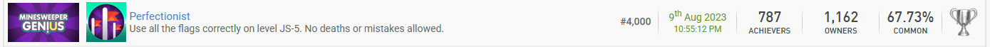 Aus "Minesweeper Genius". Nachdem die 2000ste Trophäe schon "Perfectionist" hieß und es zufällig in dem Spiel, dass ich damals gerade spielte auch eine solche gab, war klar, dass ab dem Zeitpunkt alle 2000 Trophäen eine mit "Perfektionist" aufploppen soll. Tipps und Hinweise auf Spiel mit diesem Trophäennamen bitte an mich