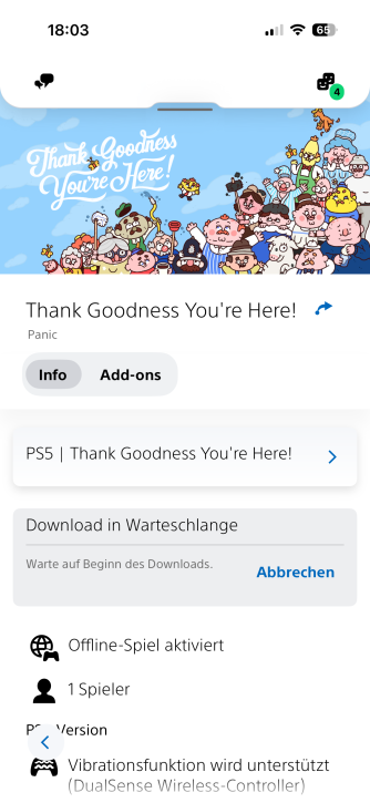 4. @NickNorris du magst ja so durchgeknallte lustige Games. Im Spielekatalog bei ps+ gibts nun Thanks goodness youre here, kann ich dir und auch allen anderen nur emofehlen. Dauert zur platin auch nur 3std, aber die lohnen sich. Selten so in nem Spiel gelacht. Schau dir mal den Trailer an, als die Musik einsetzte war mir sofort klar ,ich muss das spielen.