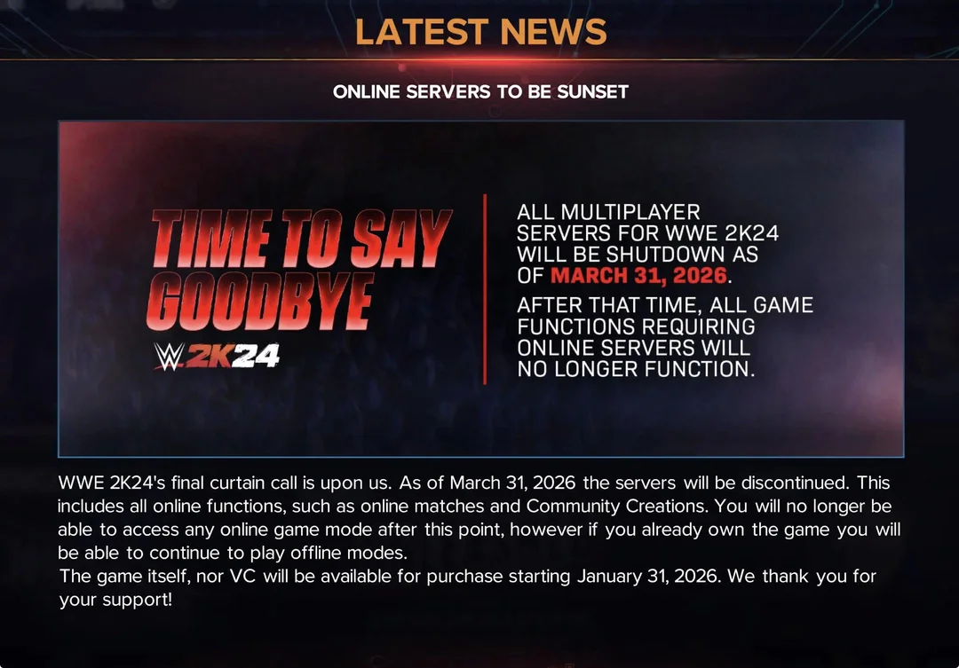Hatte im Startpost jetzt nichts gefunden. Die Server für WWE2k24 werden am 31. März diesen Jahres abgeschaltet. Die Online-Trophäen sind dann somit nicht mehr möglich. Hierzu gehören unter anderem der Modus "MyFaction", sowie Community Creations, auf welche man keinen Zugang mehr haben wird. Anbei mit Bildbeweis: