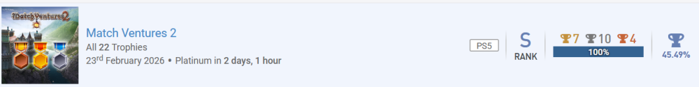 Dann holen wir auch gleich mal Bronze! Ich melde "Match Ventures 2" hiermit als fertig und nehme die nachfolgenden Foren-Trophäen mit. Komplettiere ein neues Spiel mit einer Komplettierungsrate von 25,00 - 74,99 %. Das Spiel hat eine Platin-Rate von 45,49%: Komplettiere ein neues Spiel aus einer Reihe, in der du bereits ein Spiel auf Platin / 100 % hast. Eine Serie haben wir hier auch wieder, von der ich auch bereits den ersten Teil abgeschlossen habe, wie hier ersichtlich ist. Komplettiere ein neues Spiel mit einer Schwierigkeit von 1,00 - 3,99. Ich habe für das Spiel leider nirgendwo irgendwelche Schwierigkeitsbewertungen gefunden und es daher selbst bewertet, wie hier zu sehen. Von mir gab es dafür eine 2. Komplettiere ein neues Spiel, für das es keinen Guide gibt. Ich hätte für das Spiel nirgendwo einen Guide gefunden, daher eignet es sich auch gut für diese Foren-Trophäe und einen weiteren Leitfaden im Event-Zeitraum. Komplettiere ein neues Spiel mit einer Spielzeit von 5,00 - 24,99 Stunden. Laut Playstation App habe ich das Spiel für insgesamt 19 Stunden gespielt, was ich auch hier so bewertet habe. Zum Vergleich noch die Fastest Achievers auf psnprofiles, die auch alle bei Zeiten von 17 Stunden aufwärts liegen.