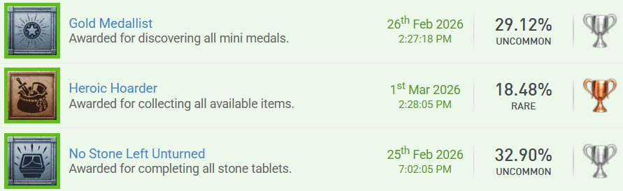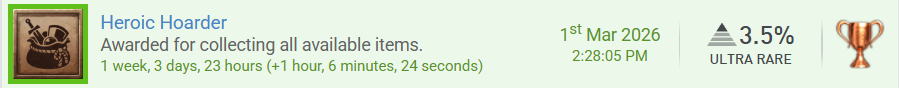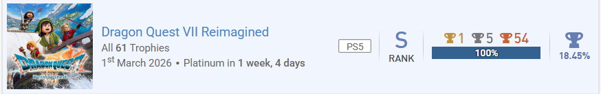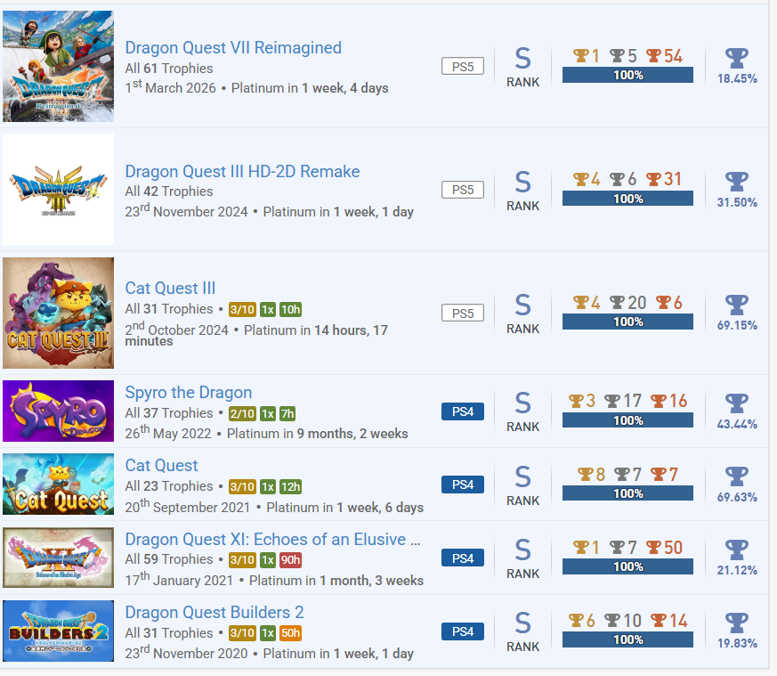 Dragon Quest VII Reimagined Poste eine Trophäe oder einen Screenshot aus einem Minispiel. Je mehr Spieler dieselbe Art von Minispiel posten, desto mehr ist die Trophäe wert. Erspiele drei Trophäen, für die etwas gesammelt werden muss. Erspiele eine Trophäe, deren Name oder Bild etwas mit Transport, Lagerung, Optimierung oder ähnlichem zu tun hat. Komplettiere ein neues Spiel aus einer Reihe, in der du bereits ein Spiel auf Platin / 100 % hast. Erreiche Stufe 50 in einem Spiel (egal ob als Charakterlevel oder der Stage). Komplettiere ein neues Spiel, für das es keinen Guide gibt. Komplettiere ein neues Spiel mit einer Komplettierungsrate von 5,00 - 24,99 %. kann ich Spielzeit und Schwiergikeit auch nachreichen, so altes ist es ja noch nicht.
