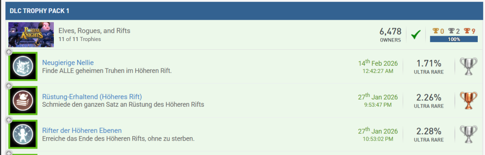 21. Aufgrund dieses Threads bin ich auf das Spiel gestoßen und es hat mich gefesselt, leider gab es mit dem neuen Update keine neuen Trophäen, aber es sind wohl noch 2 weitere Updates angekündigt für dieses Jahr. Es würde mich freuen, wenn noch die ein oder andere Trophäe dazukommt. Im Post weiter oben habe ich gesagt, dass ich mehr als 3/10 in der Schwierigleit bewerten würde. Aber nachdem die Gebäude aufgewertet waren, war es doch relativ einfach. Schwierigkeit: 3/10 Zeitaufwand: 33 Stunden Spielspaß: 10/10