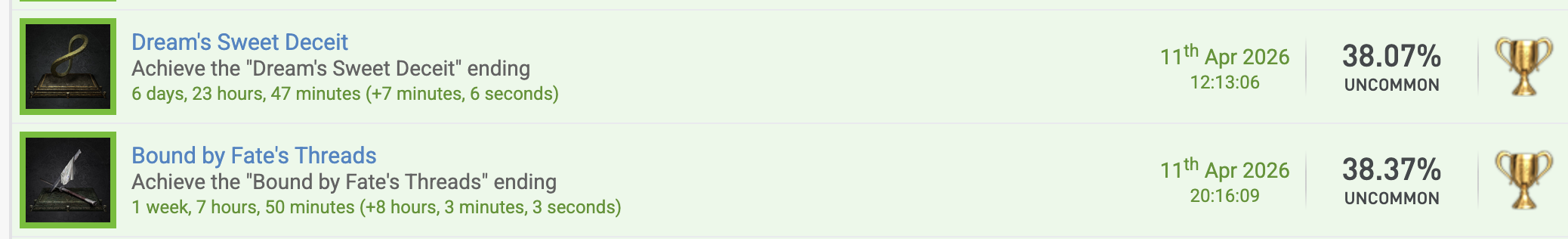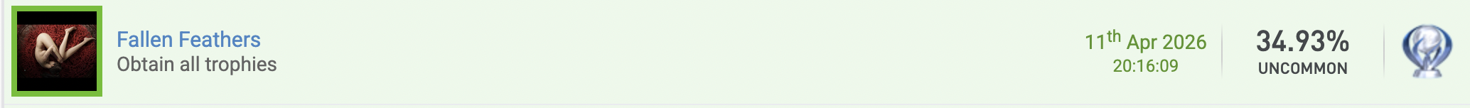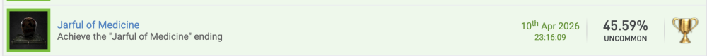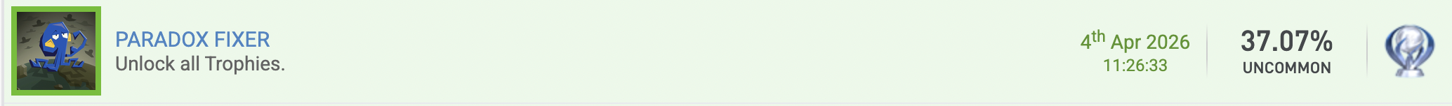 3. ein Cupcake Ein Krug mit genug Medizin 3x Wuchang: Fallen Feathers Das Spiel hat mehrere Enden, für die Trophy "Bound by Fate's" muss man mehr Dinge erledigen, um es freizuschalten, daher ist es das geheime Ende. Wuchang: Fallen Feathers In Wuchang kann man mehrere Abkürzungen freischalten, durch das herunterlassen von Leitern oder umtreten von Bäumen. Da es schwer zu beweisen ist, hänge ich ein Video aus YT mit an, wo einige dieser Abkürzungen gezeigt werden. Darwin's Paradox! In dem Spiel spielt man einen Oktopus von PowerPyx: Da ich nirgends eine offizielle Zeitangabe finden konnte, zeige ich die Fastest, die alle über 5h liegen: Ich habe nirgends Bewertungen zu dem Spiel gefunden, ich selbst würde eine 4/10 vergeben und das hier vorerst als Platzmerker platzieren, da ich nicht weiß wie das in solchen Fällen jetzt ist. Die 14 Tagesfrist ist am 14.04. rum.