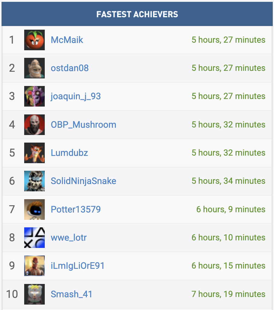 16. Für die Platin habe ich 19 Stunden gebraucht, aber nur weil ich das Spiel schon davor gespielt habe.