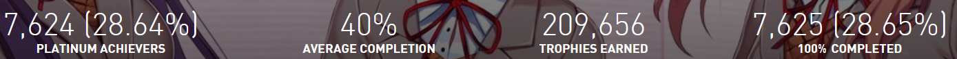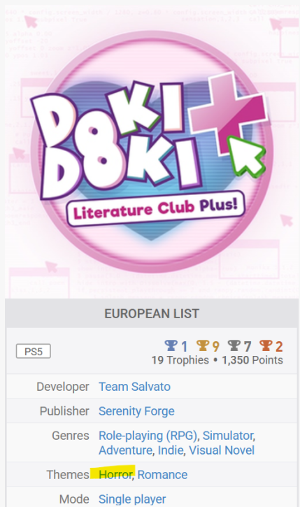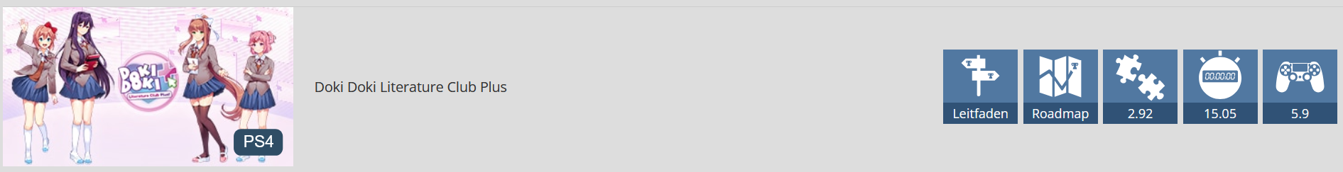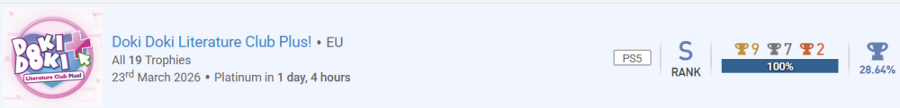 Mit "Doki Doki Literature Club Plus!" habe ich auch wieder ein bisschen was im Gepäck. Komplettiere ein neues Spiel mit einer Komplettierungsrate von 25,00 - 74,99 %. Das Spiel hat eine Komplettierungsrate von 28,65%: Erspiele eine Trophäe für ein geheimes Ende. Das Spiel hat ein Secret Ending, das ein bisschen die vierte Wand durchbricht und einem, nachdem man ziemlich kompliziert mit Speicherständen rumfuchsen musste, eine Nachricht des Erfinders zum Abschluss schenkt. Dafür gibt es auch eine Trophäe: Komplettiere ein neues Spiel mit einer Schwierigkeit von 1,00 - 3,99. Ich glaube einmal kann ich die noch mitnehmen - das Spiel ist bei uns im Forum mit 2,92 bewertet worden: Komplettiere ein neues Spiel mit einer Spielzeit von 5,00 - 24,99 Stunden. Mit ungefähr 15 Stunden ist man, wie bei der vorherigen Forentrophäe im Spoiler zu sehen, ganz gut dabei! Komplettiere ein neues Spiel aus dem Genre "Horror" oder "Mystery". Das Spiel ist auf psnprofiles mit "Horror" als Theme gelistet: @Tigress sag mir bitte kurz Bescheid oder markiere mich, wenn du dann auch damit fertig bist, damit wir die Mentoren-Trophäe beide melden können.