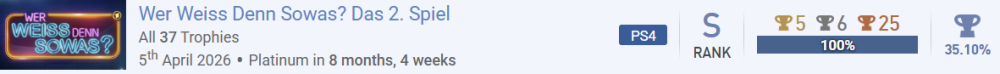 Update 05.04.26 - 29.03.2026 Gespielte Spiele: 2108 +1 Abgeschlossene Spiele: 1812 +3 Fertigstellung: 90,38 +0,04 Unverdiente Trophys 8.473 -30 Trophys Pro Tag 7,74 +0,00 Update 29.03.26 - 15.03.2026 Gespielte Spiele: 2107 +3 Abgeschlossene Spiele: 1809 +4 Fertigstellung: 90,34 +0,00 Unverdiente Trophys 8.503 +22 Trophys Pro Tag 7,74 +0,00