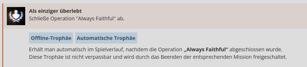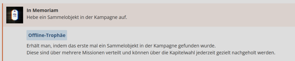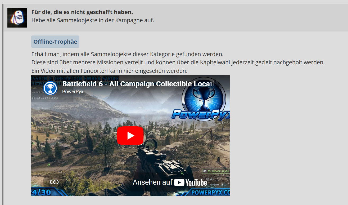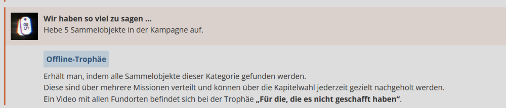 Hallo @deniskajudu, schön, dass du die Community mit einem Leitfaden für dieses Spiel unterstützen möchtest. Ich würde dir zunächst unser Leitfaden-Tutorial empfehlen. Darin findest du viele hilfreiche Informationen, die du bei der Erstellung eines Leitfadens beachten solltest. Ich möchte dir hiermit auch ein erstes Feedback geben, da es noch ein paar Punkte gibt, die du in deinem Entwurf überarbeiten müsstest, bevor wir ihn zuteilen können. Um das Feedback übersichtlicher und für dich verständlicher zu gestalten, habe ich die Themen in die nachfolgenden Spoiler gepackt. Am Ende habe ich dann noch ein paar Verständnisfragen zu dem Leitfaden. Allgemeine Infos: Mini-Roadmap: Automatische Trophäen Fettschrift und Anführungszeichen - z.B. bei der Trophäe "Als einziger überlebt" Informationen oder Details bei den Trophäentipps ergänzen Verweise & Videos Bei den Trophäen könntest du grundsätzlich noch ein paar Details ergänzen, um den Leitfaden noch etwas ausführlicher zu machen. Ich würde dir bei Bedarf dann weitere Unterstützung und ggf. noch weiteres Feedback geben. Beim Leitfaden für den "DLC Battlefield Redsec" gelten die Punkte ebenfalls. Bitte auch dort die entsprechenden Anpassungen vornehmen. Bitte schau dir auch noch die Kommentare der anderen User an, ob du die Tipps und Infos noch in deinen Leitfaden einbauen kannst. Wenn diese für den Leitfaden nützlich sind und du sie verwendest, dann kannst du am Ende im Leitfaden die entsprechenden User in der Danksagung erwähnen. Wenn du hierzu Fragen hast, stehen wir dir natürlich gerne zur Verfügung. Viele Grüße