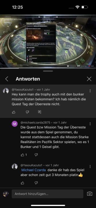 Hallo Trophäen-Gemeinschaft, ich habe eine Frage zu der Mission „Tage der Überreste“ im Pazifischen Nordwesten. Ich würde gerne diese zum farmen der „50 Lager-Kassetten“ spielen ABER die Mission ist bei mir EINFACH NICH DA…..😳 Will unbedingt diese Mission farmen, weil man hier neben den 2 Lager-Kassetten pro Mission auch noch 3 AIM Gefangenen pro Mission für die Trophäe „Retter des Volkes“ [100 AIM-Gefangene retten] befreien kann. -„Hauptgeschichte“ ist abgeschlossen -„Ikonische Avengers“ ist abgeschlossen -„Eine Weltweite Offensive“ ist abgeschlossen -„Heldenstock-Feuerprobe“ ist abgeschlossen Was mache ich falsch? Hier bei uns im Trophäen-Leitfaden steht folgendes: Fundgrube 50 Lager-Kassetten öffnen. [Multi-Trophäe] Erhält man, wenn man 50 Lager-Kassetten, die in verschiedenen Bunkern verteilt sind, geöffnet hat. Es werden nur die Kassetten mit dem Shield-Symbol auf dem Deckel gezählt. Fundorte für Bunkerkoordinaten findet man in folgenden Missionen: "Tage der Überreste" → Region: "Pazifischer Nordwesten": In dieser Mission kann man zwei SHIELD-Anlagen finden. Man schaltet sie allerdings erst im Laufe der langen Missionsreihe „Oberste Herrschaft“ im Endgame frei. Zu Beginn der Mission sollte man sich die ganze Zeit links halten und der Wand folgen, bis das kleine Radarsymbol eingeblendet wird. Diesem Signal muss man dann weiter folgen und stößt am Ende auf die erste Anlage. Die zweite Anlage befindet sich zwischen den beiden Containern mit den AIM-Gefangenen, die man befreien soll. "Starke Realitäten" → Region: "Pazifischer Nordwesten": Man sollte sich von Beginn an in der Mission links halten und dann dem Radarsignal zur SHIELD-Anlage folgen. "Unsere kleine Stadt" → Region: "Utah-Badlands": Im hinteren linken Bereich des Missionsgebiets kommt man an Polizeiautos vorbei und muss dann den Eingang zu einer Höhle nehmen, wo sich die Anlage befindet. Das Radarsignal zeigt den Weg zur Anlage, wenn man in der Nähe ist. Hinweis: Es kann vorkommen, dass die Trophäe nicht freigeschaltet wird, obwohl man die erforderliche Anzahl an Lager-Kassetten geöffnet hat. In diesem Fall sollte man konsequent nur die versteckten, unterirdischen Shield-Bunker aufsuchen und dort auch nur die Kassetten mit dem Shield-Symbol auf dem Deckel öffnen. Andere Kassetten sollte man ignorieren. Außerdem findet man Kassetten mit dem Shield-Symbol auch in anderen Missionen. Diese zählen für die Trophäe nicht hinzu, da lediglich die 50 Kisten mit den Bunkerkoordinaten zu öffnen sind. Tipp: In der Mission "Tage der Überreste", die nach Abschluss der Kampagne verfügbar ist, kann man zwei Lager-Kassetten finden. Die Mission kann man so lange wiederholen, bis man die nötige Anzahl an Lager-Kassetten geöffnet hat. Wenn man in dieser Mission auch noch die drei Inhumans befreit, kann man außerdem die Anzahl von 100 AIM-Gefangene für die Trophäe "Retter des Volkes" schneller erreichen. Hoffe ihr habt ein Tipp für mich.