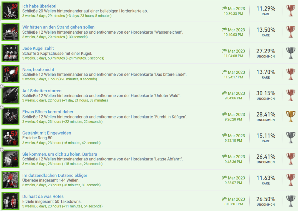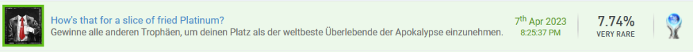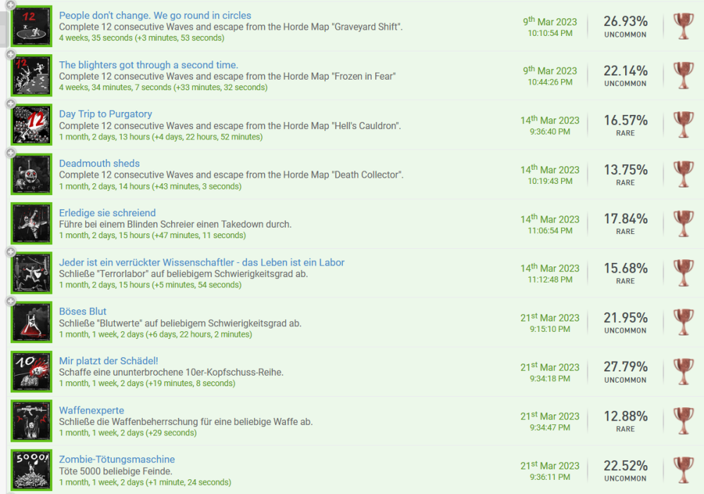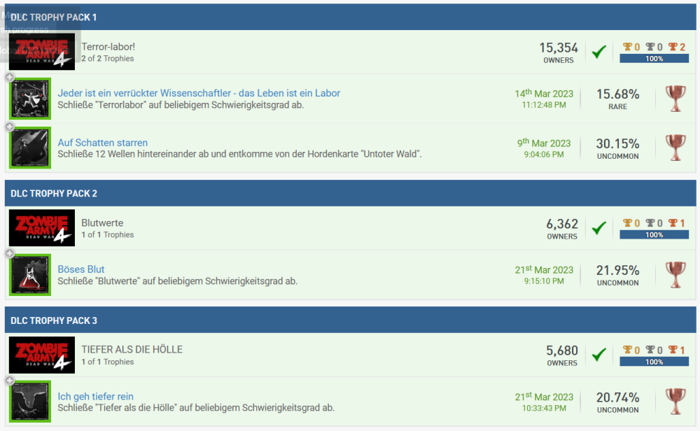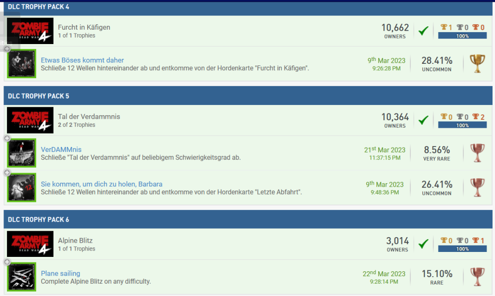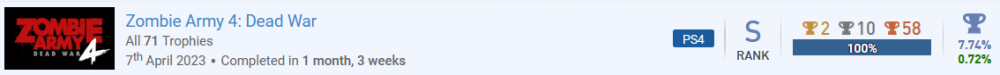 Zombie Army 4 B2 - Komplettiere ein Spiel mit einer Komplettierungsrate von 05,01% - 24,99%. → 7,74% B4 - Komplettiere ein Spiel mit einer Schwierigkeit von 1,00 - 3,99. → 3,59 V2 - Komplettiere 3 DLC Packs in einem Spiel. → DLC 1-3 V2 - Komplettiere 3 DLC Packs in einem Spiel. (nochmal) DLC 4-6 V3 - Komplettiere ein Spiel und alle DLCs zu 100% (min 2 DLCs Packs und beide bei 0%) → Hauptspiel wurde erst nach Eventbeginn platiniert, sowie auch mindestens 2 DLC's V10 - Schaffe einen Spieldurchgang auf einem schweren Schwierigkeitsgrad oder NG+ C6 - Erspielt mindestens zu dritt 10 Trophäen. → Ich hab das Spiel zusammen mit @AiMania, @john_cena1993 und @glupi74 (kein Eventteilnehmer) gespielt. Die Trophäe möchte ich gerne 3x einreichen, es folgen 3 Spoiler für die Nachweise: 1. 2. 3. Zum verifizieren hier noch die Listen meiner Mitstreiterinnen. Nicht jede Trophäe kam gleichzeitig, aber insbesondere die für Kartenabschlüsse. https://psnprofiles.com/trophies/10318-zombie-army-4-dead-war/Ai-ds_low?order=date https://psnprofiles.com/trophies/10318-zombie-army-4-dead-war/john_cena1993?order=date -