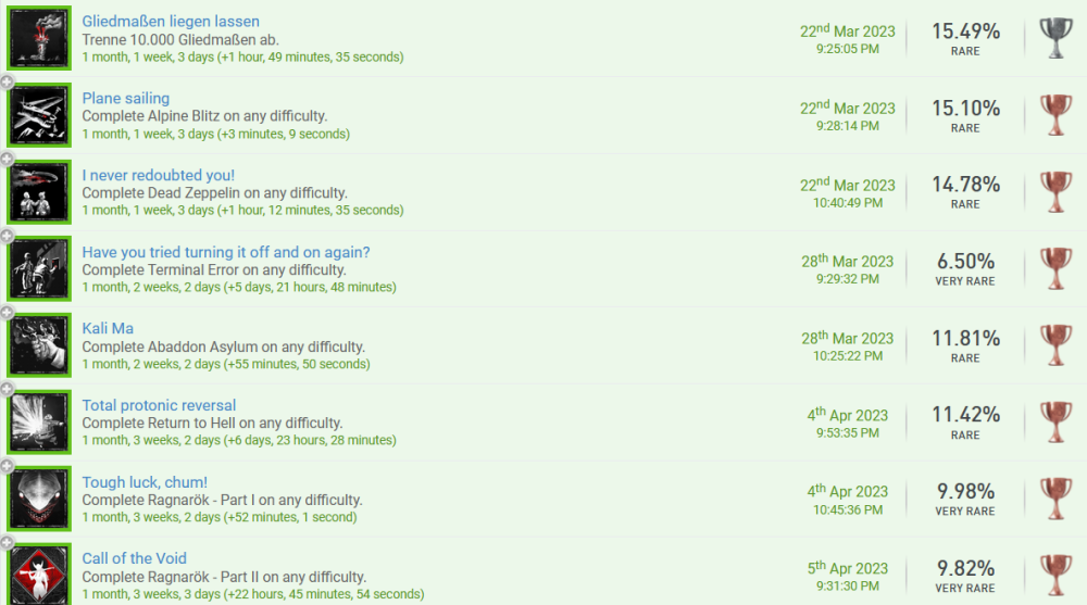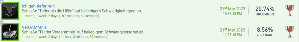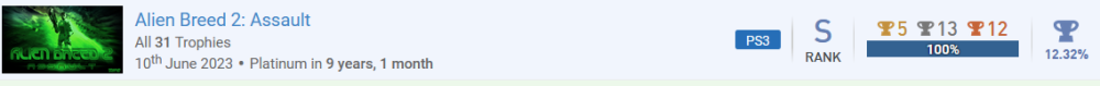 Alien Breed 2: Assault B2 - Komplettiere ein Spiel mit einer Komplettierungsrate von 05,01% - 24,99%. → 12,32% B5 - Komplettiere ein Spiel mit einer Schwierigkeit von 4,00 - 7,99. → 5,43 B9 - Komplettiere ein Spiel, was vor 2020 gestartet und bis Eventbeginn nicht beendet wurde. → Hab zwar nicht mehr soviel offen, aber das Event hat mich dann doch nochmal dazu angespornt das hier zu probieren und hat sich gelohnt -