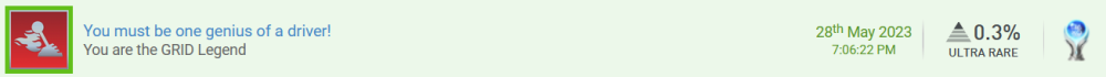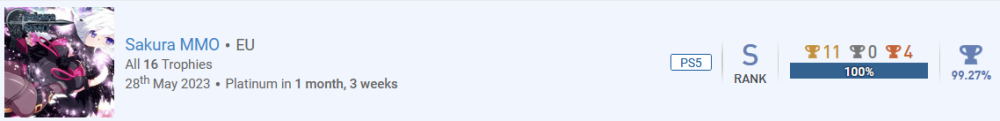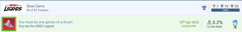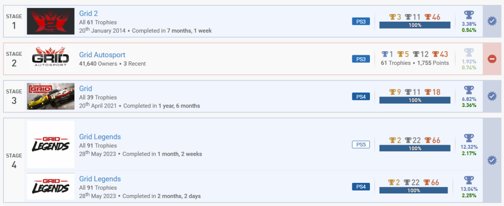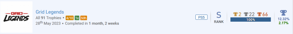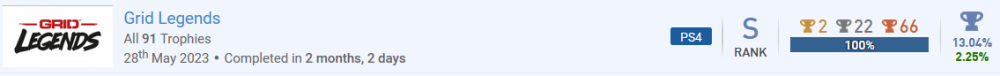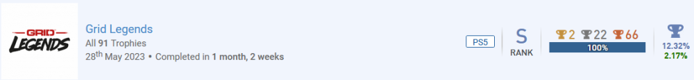 Grid Legends PS5 Hinweis: Es gibt kein Autopop oder Trophy Synch zwischen den PS4 und PS5 Versionen. Alles muss vollständig zweimal erspielt werden für die Doppelplatin. N2 - Komplettiere ein Spiel mit einer Komplettierungsrate von 05,01 - 24,99%. → 12,32% V3 - Komplettiere ein Spiel und alle DLCs zu 100% (min 2 DLCs Packs und beide bei 0%) → Alle DLC + Hauptspiel im Event abgeschlossen V4 - Komplettiere ein Spiel aus einer Reihe in der du mindestens eine Platin/100% hast. V5 - Komplettiere zwei Spiele aus einer Spielereihe. Grid Legends wurde 2x platiniert und wenn ich die Trophäenbeschreibung richtig deute, wäre das erlaubt Sakura MMO - PS5 V14 - Komplettiere einen Nischen-Titel. → Nochmal Sakura MMO, diesmal die PS5 Version. Das Spielt wird als Visual Novel geführt. -