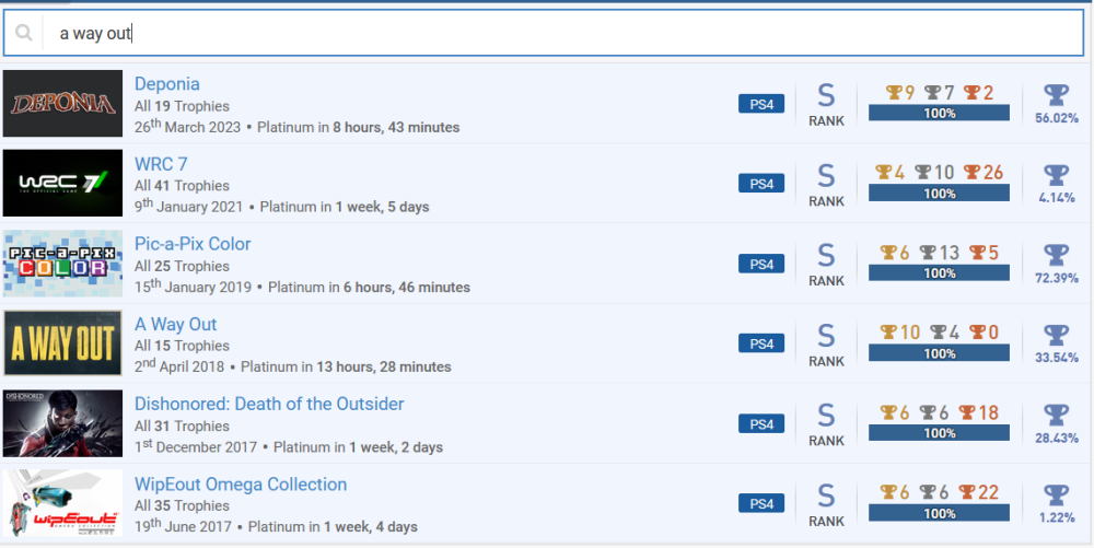 Allgemeine Trophäen E2 - Erspiele fünf Trophäen die "First/Erster/Start" beinhalten. E4 - Erspiele fünf Trophäen die einen Bezug zu Tieren haben. E5 - Komplettiere ein Spiel des Monats. 2x → A Way Out & Deponia wurden abgeschlossen E8 - Komplettiere drei Spiele mit gleichem Genre. → Adventure: God of War Ragnarök, Dead Island 2, Ghostwire Tokyo E10 - Komplettiere drei Spiele mit gleichen Release Jahren. → 2022: Cannibal Cuisine, Grid Legends, God of War Ragnarök E17 - Komplettiere ein Spiel aus dem letzten Event. → Grid Legends (ziemlich mittig auf der Collage) -