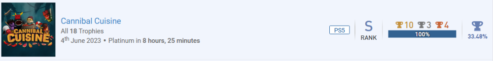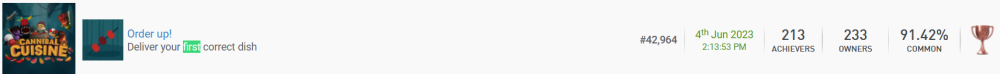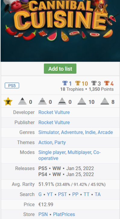 Cannibal Cuisine N5 - Komplettiere ein Spiel mit einer Schwierigkeit von 4,00 - 7,99. → 5,75 N7 - Komplettiere ein Spiel mit einer Spielzeit von 4,00 - 19,99 Stunden. → 8h V7 - Komplettiere ein Spiel, welches in deinem Profil unpopulär ist. → Ich mag solche Kochspiele eigentlich gar nicht und spiele nur die, zu welchen mich @john_cena1993 zwingt Und bin jedes Mal froh, wenns vorbei ist V13 - Komplettiere einen Indie-Titel. -