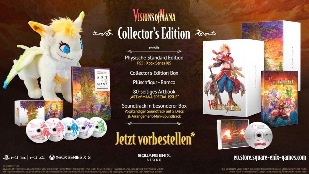 Visions of Mana erscheint am 29. August Mit einem neuen Trailer hat Square Enix den Erscheinungstermin von Visions of Mana bekannt gegeben. Demnach erscheint das Action-Rollenspiel am 29. August 2024 für PlayStation 5, PlayStation 4, Xbox Series und PC. Der neue Trailer stellt die Charaktere Palmina und Julei vor, mit denen Val und Hina sich auf ihrer Reise anfreunden. In Visions of Mana können könnt ihr euer eigenes Dreierteam aus den fünf spielbaren Charakteren Val, Carina, Morley, Palmina und Julei zusammenstellen, während ihre Begleiter Ramco, Ashe und Hina sie unterstützen. Der Trailer gewährt uns außerdem einen Blick auf einige Gameplay-Features, darunter die Geisterreliquien. Dabei handelt es sich um mystische Artefakte, denen die Macht der Elemente innewohnt. Diese ermöglicht es euch,eure Klasse zu wechseln und im Kampf neue Fähigkeiten zu erlangen. Jeder Charakter verfügt für jede Geisterreliquie über eine eigene Klasse. Des weiteren kehrt das bekannte Ringmenü zurück, mit dem ihr den Kampf pausieren und eure nächste Aktion planen könnt. In der weiten, farbenfrohen Welt finden sich zudem Elementare Hürden, hinter denen sich neue Orte zur Erkundung oder Gegenstände verbergen. Die Welt könnt ihr aber nicht nur zu Fuß erkunden, sondern durch eure Reisegefährten Vuscav und Flämmchen auch zu Meer und in der Luft. Die Editionen im Überblick Neben einer Standard-Edition für 69,99€, die physisch und digital erscheint, enthüllt Square Enix auch eine digitale Deluxe-Edition und eine physische Collectors-Edition. Die digitale Deluxe-Edition kostet 89,99€ und enthält zusätzlich zum Spiel das Mana-Kostümset, das Mana-Soundtrack-Set und 24 Stunden Vorabzugang. Die Collectors-Edition, die es für 219,99€ exklusiv im Store von Square Enix gibt, enthält zusätzlich zur Standard Edition des Spiels eine Plüschfigur von Ramco, das Artbook ART of MANA SPECIAL ISSUE, und den Original-Soundtrack von Visions of Mana in einer besonderen Collectors-Edition-Box. Wer eine der beiden digitalen Editionen vorbestellt, erhält als Bonus die »Kühne Klinge« für Val. Wer außerdem das Spiel digital bis zum 30. September 2024 kauft, erhält als Frühkäuferbonus »Khodas Kluft« für Val sowie ein »Starterpaket«, ein Item-Set, mit dem für einen bestimmten Zeitraum gewonnene Erfahrungspunkte und Lucre erhöht werden. Wer eine der beiden physischen Editionen vorbestellt, erhält »Khodas Kluft« sowie das »Starterpaket« .