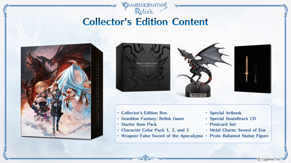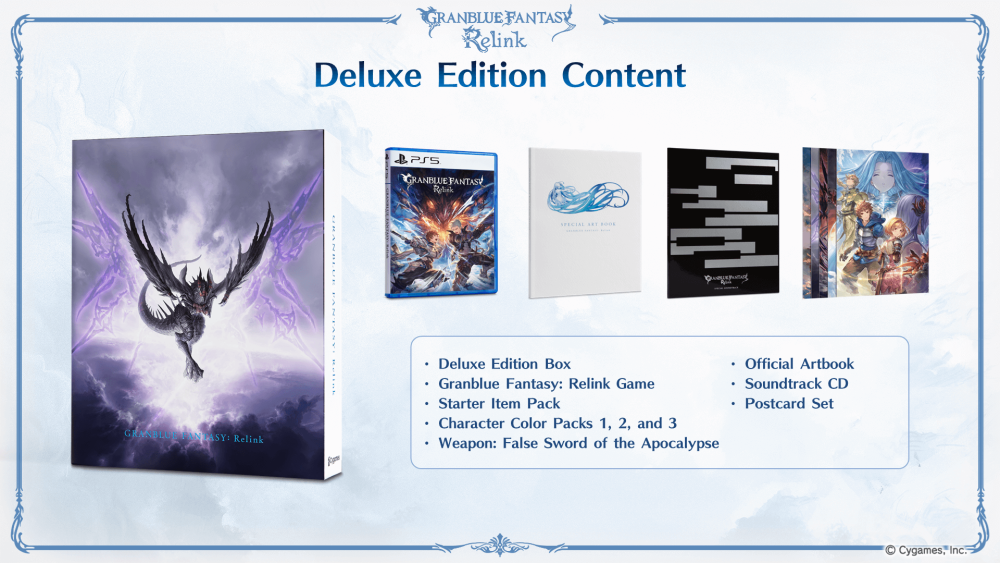 Granblue Fantasy: Relink erscheint am 1. Februar 2024 Während »Gamescom 2023: Opening Night Live«-Show hat Cygames endlich den Erscheinungstermin von Granblue Fantasy: Relink bekannt gegeben. Das Action-Rollenspiel wird demnach am 1. Februar 2024 für PlayStation 5, PlayStation 4 und PC-Steam erscheinen. Unten könnt ihr euch einen neuen Story-Trailer anschauen. Neben einer Standard Edition wird es auch eine physische Delxue Edition sowie eine Collectors Edition geben. Die Deluxe Edition wird nur in Nordamerika für 99,99 UD-Dollar erhältlich sein und enthält zusätzlich zum Spiel ein spezielle Boxcover mit Proto-Bahamut, den Soundtrack auf CD, ein Postkarten-Set und ein DLC-Paket mit Start-Items, neuen Farben und eine neue Waffe. Die Collectors Edition wird auch hierzulande angeboten, für 189,99€. Diese enthält zusätzlich zum Inhalt der Deluxe Edition noch eine Figur von Proto-Bahamut und einen Metall-Anhänger. Digital wird es neben einer Standard Edition eine Special Edition für 79,99€ und eine Deluxe Edition für 99,99€ geben. Die Special Edition bietet lediglich neben dem Spiel das DLC-Paket mit Start-Items, neuen Farben und eine neue Waffe. Die Deluxe Edition bietet darüber hinaus auch ein digitales Artbook und den digitalen Soundtrack. Alle physischen und digitalen Editionen enthalten des weiteren einen Code mit dem »Granblue Special Item Set: Relink Pack«, welches spezielle Items für das Mobile Game bereithält. Vorbestellen kann man die Editionen ab dem morgigen Tag. -