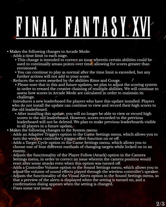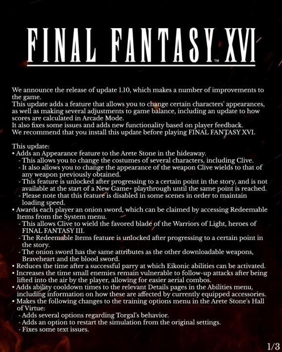 Final Fantasy XVI - Neues Update bringt neue Inhalte und Features; kostenpflichtige DLCs bestätigt Square Enix hat heute für Final Fantasy XVI die Version 1.10 veröffentlicht. Zudem wurden im Rahmen des »Voices from Valisthea«-Panels von Square Enix auf der PAX West 2023 nicht nur eine PC-Version sondern auch zwei kostenpflichtige DLCs bestätigt. Diese Ankündigung machte Producer Naoki Yoshida in einer Videobotschaft höchstpersönlich. »Wie ich bereits erwähnt habe, haben wir so viele Meinungen und Reaktionen von unserer Final Fantasy XVI-Spielergemeinschaft erhalten«, so Yoshida. »Aber eine Sache, die besonders deutlich wurde, war der Wunsch, mehr von Valistheas Geschichte zu sehen und mehr Zeit mit ihren Bewohnern zu verbringen. Um dem gerecht zu werden, hat das Entwicklerteam mit der Arbeit an zwei Teilen der kostenpflichtigen herunterladbaren Inhalte begonnen.« Informationen zu den herunterladbaren Inhalte gab man noch nicht Preis. Man hoffe bis Ende des Jahres mehr zu diesen und der kommenden PC-Version mitteilen zu können. Das hat die Version 1.10 zu bieten Eine der Neuerungen der neuen Version ist die Möglichkeit, fortan am Arete-Stein in Cids Versteck die Optik seiner Waffe ändern zu können.Dabei stehen euch die Skins aller Waffe zur Verfügung, die ihr in eurem Besitz habt. Außerdem gibt es mit dem Zwiebelschwert, bekannt aus Final Fantasy III, auch eine neue Waffe. Des weiteren wurden neue Kostüme für Clive, Jill, Torgal, Ambrosia und Joshua hinzugefügt. Auch an der Spielebalance hat man etwas geschraubt. So gibt es beispielsweise Anpassungen bezüglich verschiedener Zeitfenster im Kampf und auch am Arcade-Modus wurde Hand angelegt, um die Spielerfahrung ausgewogener zu gestalten. Zudem gibt es auch ein paar weitere Einstellmöglichkeiten in den Optionen. Mehr könnt ihr den Patch-Notes unten entnehmen Trailer zur Version 1.10 -