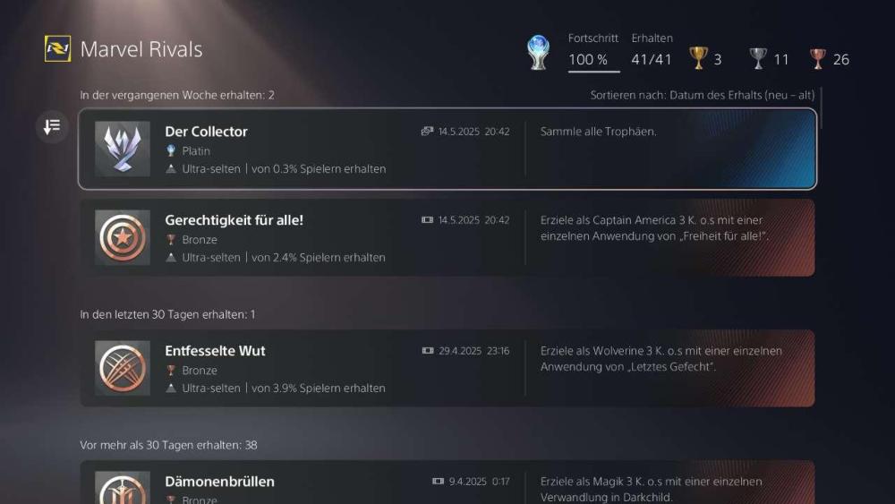 12. Gestern am späten Abend habe ich mit verdammt viel Glück endlich die Wolverine-Trophäe in Marvel Rivals gepackt; die vorletzte für Platin. 😃 Ein 3er mit der Ult von Captain America wird als Nächstes zwar auch eine Tortur, aber auch diese letzte Trophäe möchte ich unbedingt auch - wie alle anderen Trophäen bisher - ohne boosten selbst schaffen. Ansonsten war der letzte Erfolg, was Trophäen angeht, vor ein paar Wochen Platin in Dead Island 2. 🙂