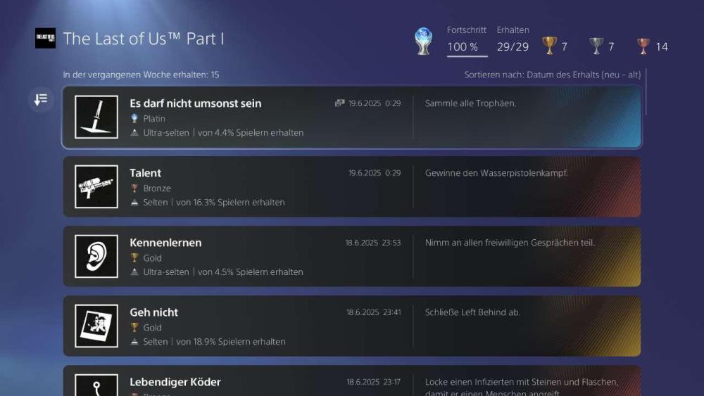 6. The Last of Us Part I auf PS5: Damals, 2014, habe ich es als mein erstes PS4-Spiel mit nur drei Trophäen nach der Story beendet und nie wieder gespielt; jetzt dank der einfacheren Liste war es aber irgendwie ein Muss - und bevor ich endlich mit Part II Remastered anfange, wollte ich den ersten Teil auf jeden Fall noch einmal erleben und natürlich platinieren. 🙂