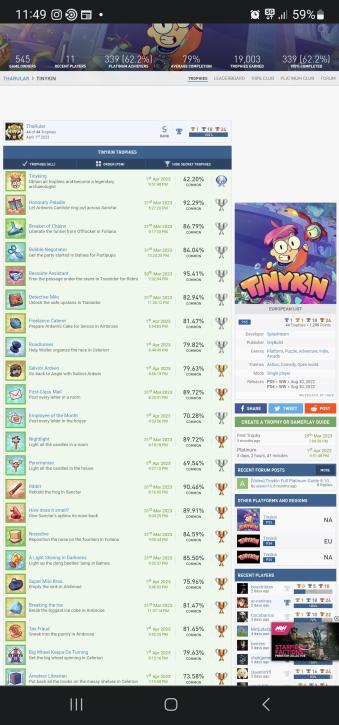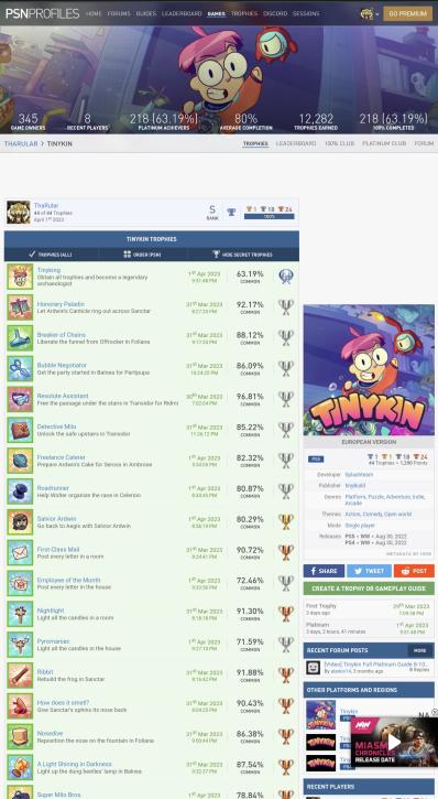 Fertigmeldung Nr. 21 und 22: Ich möchte die Trophäe N5 2x als fertig melden. Ich habe das Spiel Tinykin sowohlauf PS4 als auch auf PS5 im Eventzeitraum begonnen und platiniert. Es gibt nirgends eine Schwierigkeitsbewertung zu dem Spiel. Da es auch keinen Thread zu dem Spiel in diesem Forum gibt, konnte ich es nicht bewerten. Könnte ich das Spiel bewerten, würde ich ihm jedoch eine 4,00 geben, da es soviele Sammelitems in dem Spiel gibt, die zum Teil sehr schwer zu finden sind. Da es keinerlei Guide zu dem Spiel gibt, war es daher umso schwerer -