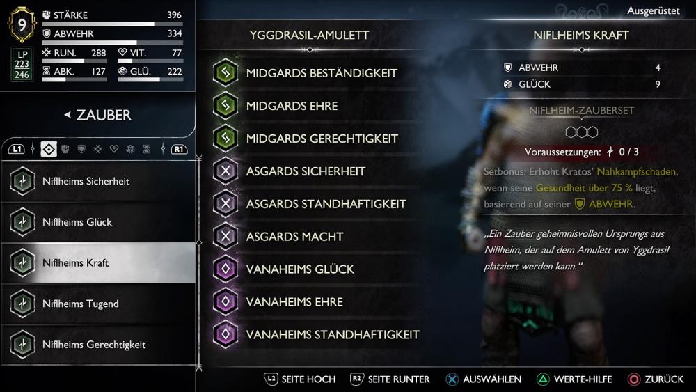DIGGGGAAAAAA! Ich hab dir ein Bild mit allen 5 Zaubern gemacht und dir gesagt, wo du die anderen drei bekommst, die du nicht hast. Schau noch mal das Foto an. Da siehst du doch auch 5 Niflheim Zauber. Es gibt von jedem Set jeweils 5 Zauber, so auch beim Niflheim Set. Sicherheit Glück Kraft Tugend Gerechtigkeit Spiel die Story ("Der Pfad"), bis du die Hauptmission "Wiedervereinigung" beendet hast und dann kannst du dir die zwei beim Schmied kaufen. Und wenn du alles 48 Raben eingesammelt hast, gehst du nach Niflheim zum Rabenbaum und öffnest die letzte Truhe. Dann sollte der Rabenwächter kommen und den tötest du dann in der Arena. Dann bekommst du den fünften und letzten Zauber.