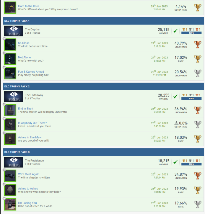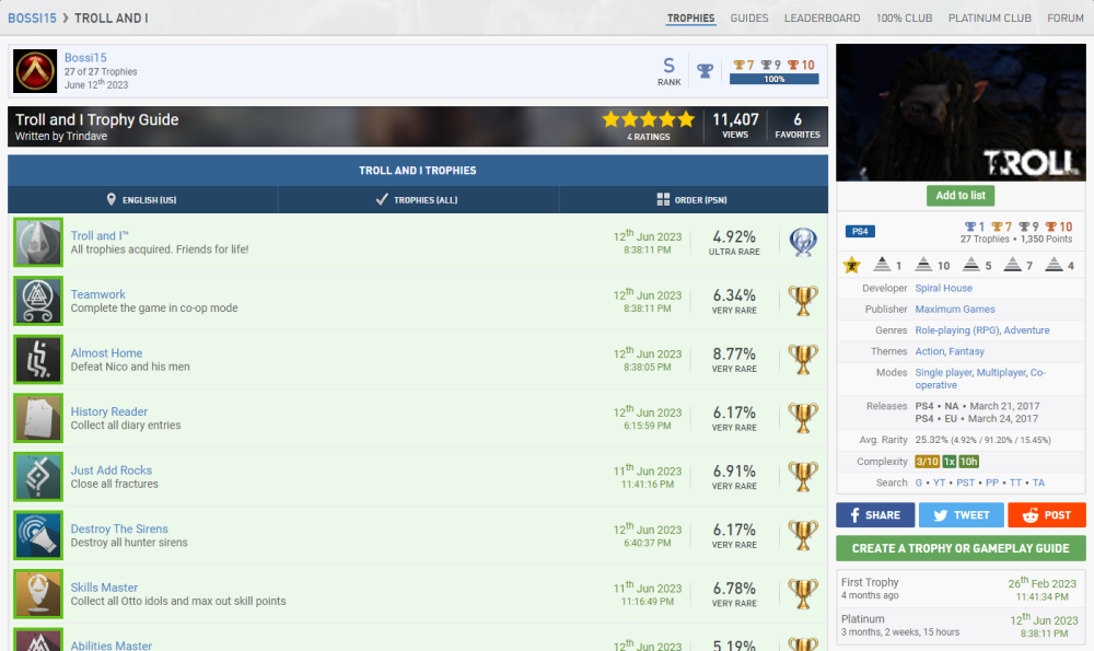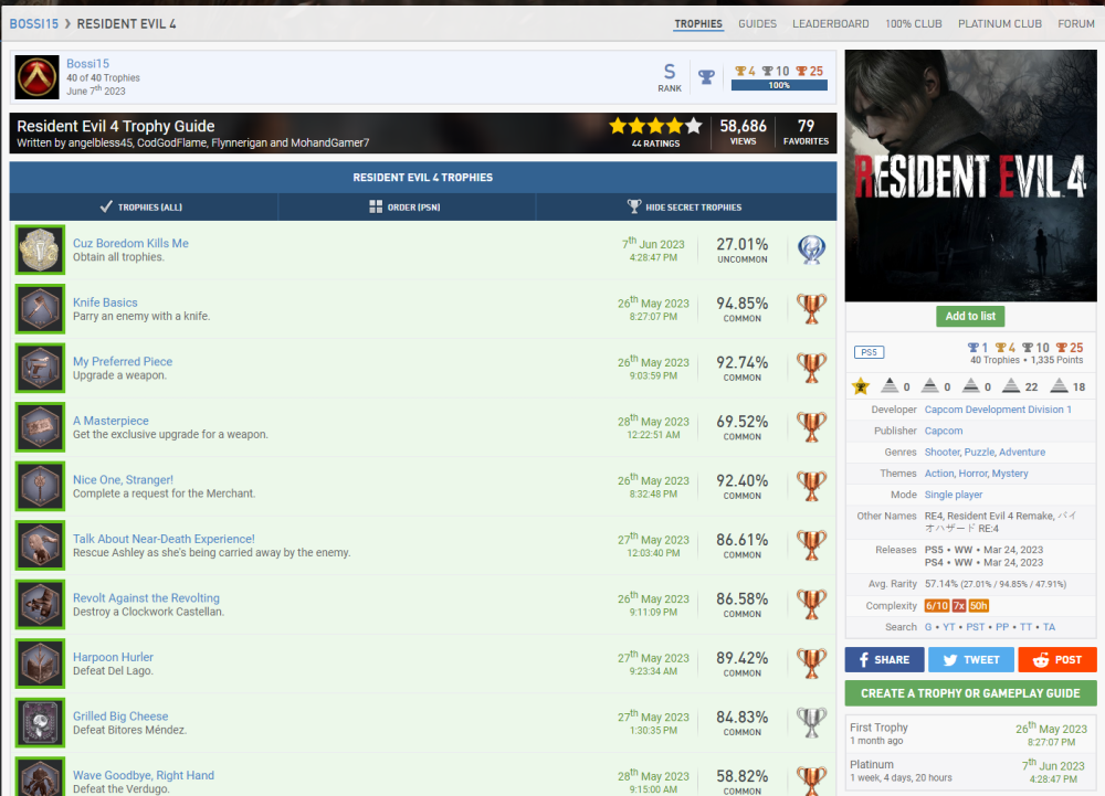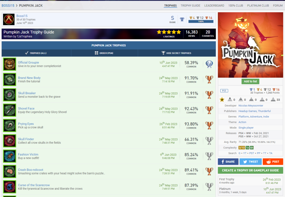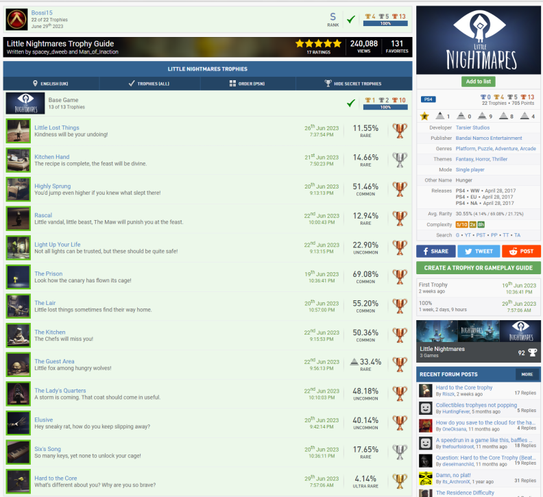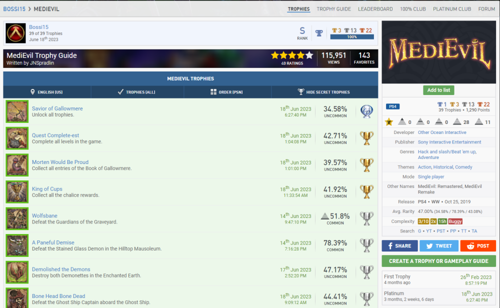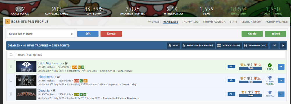 Wird mal wieder Zeit für ein paar Punkte, wa?? Mit Silber kann ich mich ja kaum noch im Stream blicken lassen, nachdem ich wieder so'n großes Maul hatte. Nach den Dreamworks Dragons Games folge erstmal das Resident Evil 4 Remake. Also das Remake von meinem All-Time Favourite Videospiel (Ich weiß gar nicht wie oft ich Resi 4 im Original gespielt habe, es war sehr sehr oft und quasi immer war mein bester Freund dabei, so auch dieses mal, deshalb nicht direkt zu Release, sondern erst wo wir beiden Urlaub hatten. ) Zu allererst gibt es erstmal N1 + N5 + N9, da es auch erst vor kurzem released wurde gibt es noch die V9 dazu. Und ich sage euch mal so, es ist verdammt gut. Ich war ein klein wenig Burned-Out geb ich zu, denn das Spiel jagt einen durch zig Playthrougs die allesamt auf höheren Schwierigkeitsgraden sind oder im NG+ stattfinden. Ich hätte damit komplett den V10 Block füllen können, aber ich gebe mich auch mit 2x V10 zufrieden, die anderen beiden sind ja schon durch Dead Space belegt. Da @da_emty mir meine V15 aberkannt hat bei Sekiro (Dieser Schuft) nehme ich sie doch hier gerne dazu, denn man interagiert im Laufe des Spiels mehrfach mit einem Wolf/Hund nachdem man ihn befreit hat. Die üblichen C1-Verdächtigen sind natürlich auch wieder mit dabei. Schwierigkeit Zeitaufwand Spielspaß Und wir haben auch noch ein paar Screenshots in Petto. S3 Ich finde das Gesamtbild sehr lustig, nicht nur das du vom Händler beauftragt wirst dem 2. Hauptantagonisten zu beschmutzen, indem man das Bild mit Hühnereiern bewirft. Sondern auch, dass dies ein direkter Hinweis auf eine versteckte Spielmechanik ist, denn selbst auf dem höchsten Schwierigkeitsgrad machen goldene Eier bei dem Boss 70% Schaden. Anscheinend hat Salazer eine Unverträglichkeit... S16 Natürlich völlig passend. Leider habe ich die Katzenohren zu spät erspielt, also muss der Hühnerkopf herhalten. Weiter geht es mit dem kleinen Pumpkin Jack, was mich durchaus überrascht hat. Das Spiel qualifiziert mich für B1 + B4. Zum einen haben wir es hier mit einem Indie-Titel zu tun, was uns V13 beschert. Auch mit Tieren interagieren wir wieder zu Genüge z.B. eine Eule oder auch eine Krähe und damit unsere letzte V15-Forentrophäe. C1 müssen wir diesmal auslassen, aber es sind wieder paar Screenshots dabei. S1 Alles 3 unterschiedliche Berggipfel in Pumpkin Jack und Sekiro x2 S4 Gasförmig (Nebel) in MW II / Flüssig und Fest gleichzeitig in Dragons Legends of the 9 Realms S10 In Fallout Shelter haben wir dann noch eine Familie gegründet Paar Screenshots haben wir noch, aber immer der Reihe nach. Jetzt quatschen wir erstmal kurz über Troll and I. Das Spiel qualifiziert mich erstmal für die Kombination B3 + B4. Ich hab das Spiel auch mal als Platinkette angemeldet, also wenn jemand Interesse hat gerne dran teilnehmen, der LF sollte in kurzer Zeit auch fertig sein. Da wir die Dragons-Games beide abgearbeitet haben reiche ich die anderen beiden PK's hiermit auch nochmal nach Legends of the 9 Realms und Dawn of New Riders, möchte somit also gern noch die C8 ganze 3x mitnehmen. C1 hat natürlich auch seinen Weg hierher gefunden. Schwierigkeit Zeitaufwand Spielspaß S2 können wir hier auch noch reinbuttern, denn wir haben Otto wie er 3 versch. Essen verzert. Wie er das auf dem Hügel da macht, fragt mich nicht. Er ist nen Macher. In @da_emty seinem Stream haben wir ja einen schönen Einblick in The Stanley Parable bekommen. Und da @stiller auch so drüber geschwärmt hat, dachte ich mir Hey probier es doch auch mal aus und so habe ich es schnell vorm Event in den Backlog-Pool geworfen und ich wurde nicht enttäuscht. Als erstes wie immer einmal die Kombination aus B2 + B4. (Es war eigentlich für B1 und B5 geplant, aber ich habe mir zu viel Zeit gelassen und es ist unter 25%/Schwierigkeit 4 gerutscht. Eigentlich kein Problem, sind ja 15 Punkte mehr, aber jetzt habe ich kein Spiel mehr für die letzte B1-Trophäe. Hätte nie gedacht das mein Backlog mal nicht ausreicht xD) Dann würde ich noch gerne V7 nehmen, denn mit Simulationen habe ich eigentlich nicht sehr viel am Hut. C1 möchte auch mal wieder. Schwierigkeit Zeitaufwand Spielspaß Da @stiller es empfohlen hat, hat sie es natürlich auch gespielt. Also erfüllen wir hier C2. Nach dem Walking Simulator, brauchte ich mal wieder ein wenig Action und wie geht das besser, als mit guter alter Nostalgiehaue wie MediEvil. Wird langsam langweilig, aber wir bekommen B1 + B4. V14 passt hier auch wunderbar, denn es ist genauso wie Sekiro beim letzten Mal ein Nischentitel. Auch C1 ist ja nix neues mehr Schwierigkeit Zeitaufwand Spielspaß Ein Vögelchen hat mir noch gezwitschert, dass der gute @underground9889das Ganze auf seiner Liste hat und somit würde ich gerne noch C2 mitnehmen. Sekiro, Medievil und Cat Quest II sind alle 2019 erschienen und somit würde ich gerne endlich die E10 mitnehmen. 2 Schöne Screenshot-Trophäen haben wir noch in Petto und somit endlich E13 abgeschlossen! Zum 1. haben wir hier noch S5 Resident Evil 4 Jetski MediEvil Zug Und das gute Alte Pferd in Pumpkin Jack (Autos wären auch echt langweilig) Die letzte Scrrenshot-Trophäe ist die S9 und auch die haben wir in MediEvil gefunden Zum Abschluss fassen wir unsere letzen beiden Fertigmeldungen einmal zusammen, denn es handelt sich um die komplette Reihe. Hierbei handelt es sich um das wundervolle Little Nightmares und den entsprechenden Nachfolger. Für den ersten Teil beanspruche ich die N3 + N5 + N7. Für den 2. Teil würde ich gerne die kleinen N1 + N4 + N7 beanspruchen. Für den 1. würde ich dann gerne noch 3x V1 + V2 + V3 nehmen. Das Spiel hat 3 DLC's, die habe ich alle auf 100% gebracht und somit sollte das alles so passen. Auch V5 haben wir erneut erfüllt, wie auch schon in der Dragons-Serie und was ebenfalls passt ist V6, denn es sind alle Teile fertiggestellt worden, die es in der Reihe gibt. Unsere fürs Forum so wichtige Bewertungen wollen wir natürlich auch nicht vergessen. Also bitte 2x C1. 