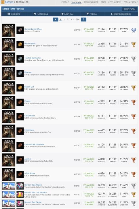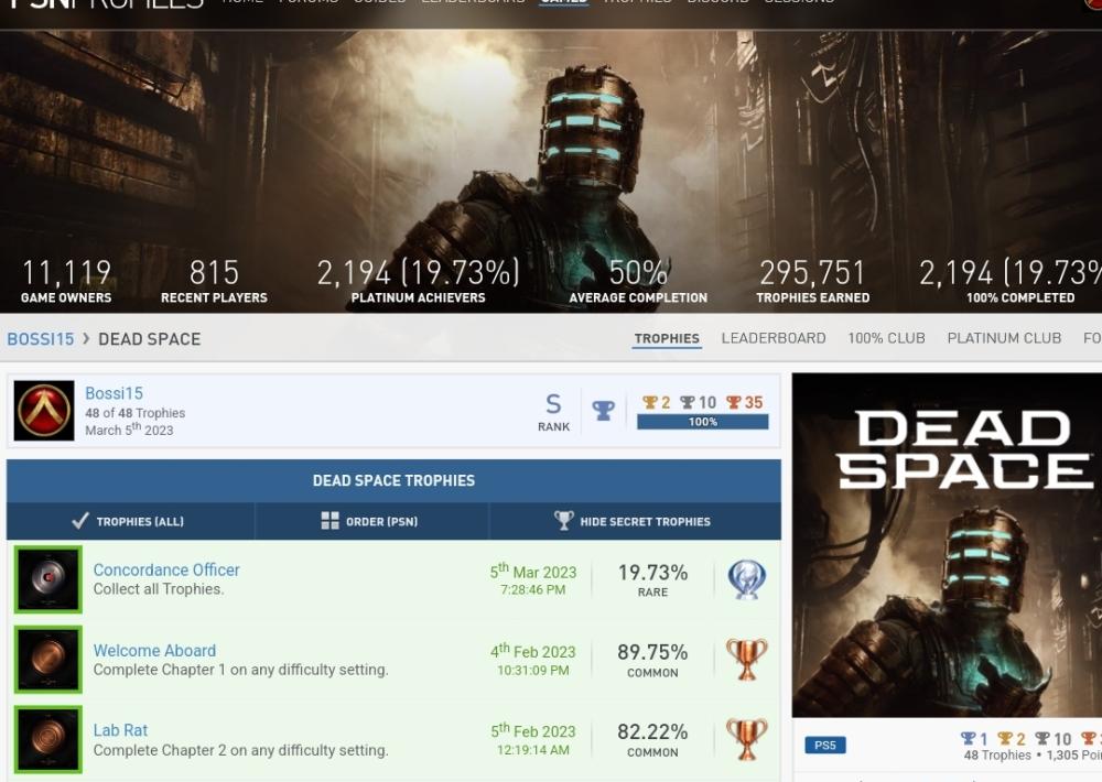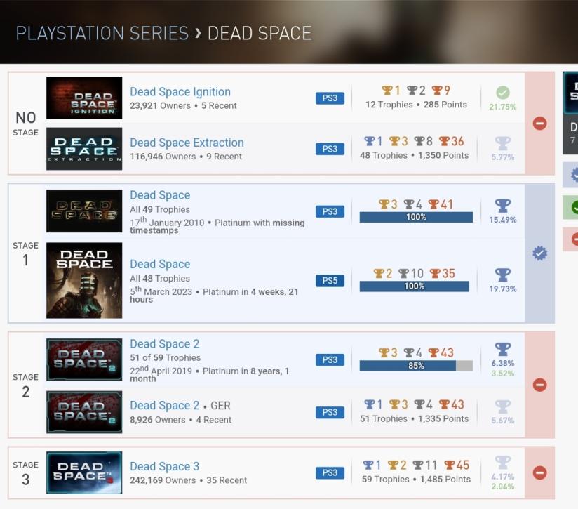 So Dead Space ist fertig, d.h. ein paar Fertigmeldungen stehen an. Meine 1. und zeitgleich 225. Platintrophäe. Viel Spaß beim prüfen @da_emtyund @Vanyar1. E19 müsste bei mir noch eingetragen werden, dass wurde übersehen. Danke euch. <3 S22 Dead Space Raumschiff S20 Dead Space Necromorph-Brute S12 Dead Space Alleine 100 Small Medi Packs S8 Dead Space. Ist doch ganz klar ein Feuer. E20 Dead Space mit entwickelt von EA Romania (War ein wenig langsam beim screenshotten ^^) C1 Dead Space Schwierigkeit Zeitaufwand Spielspaß V4 Dead Space (Es ist zwar das Remake, aber wirklich ein deutlicher Unterschied zum Original) V10 Dead Space und das gleich 2-Mal (1x NG+, 1x höchster Schwierigkeitsgrad) V11 01.03-05.03 B2 Dead Space B5 Dead Space (Aktuell bei ca. 6) Siehe Schwierigkeitsbewertung Danke euch fürs Prüfen! Ich verzichte auf E5. Finde es ein wenig schwachsinnig etwas fertig zu melden was ich vor 7 Jahren durchgespielt habe. Ich probiere es dann lieber innerhalb des Events. -