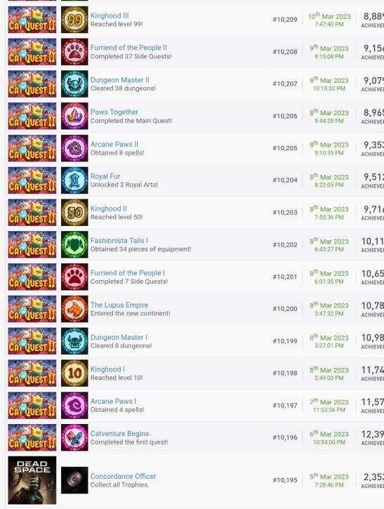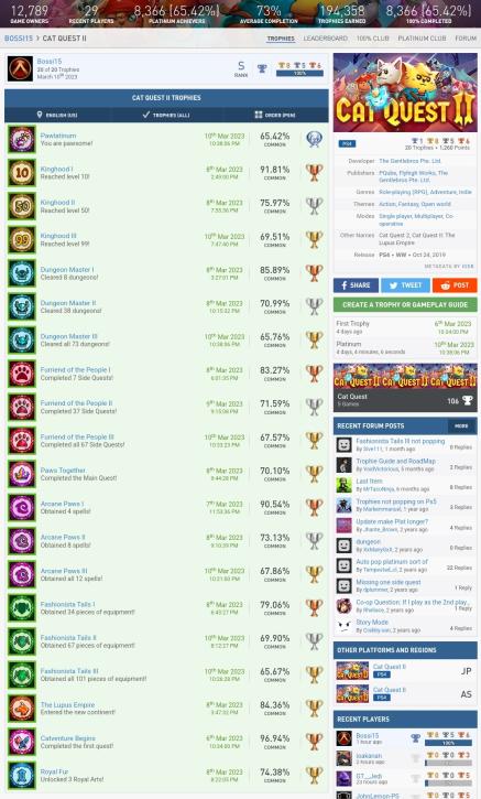Neue Fertigmeldungen stehen an! Fertig gestellt wurde Cat Quest II. Das qualifiziert für die Kombination N1 + N4 + N7. Nach der Dead Space Platin halten wir die Stream auch gut am laufen und haben die nächsten 5 Tage voll. Somit sollte erneut V11 fertig sein. Das es ein Indie-Titel ist, ist es zusätzlich noch V13 und da man wahlweise Katze oder Hund spielt ist es auch noch V15. Zeitaufwand Schwierigkeit Spielspaß Ist somit das 2. Spiel für C1 und da auch der liebe @da_emty es in seiner Liste hat, ist es auch für C2 relevant. Die Easter Egg Kategorie wollen wir auch nicht vergessen. Cat Quest 2 war im letzten Event dabei und ich müsste auch mittlerweile mind. 1 Trophäe pro Block haben. Das wäre also E12 + E17 abgeschlossen. Last but not least unsere wundervolle Screenshot Kategorie. Hier haben wir S13 + S14 + S15 für die Level 10, 30 und 99. Zu guter Letzt haben wir noch S17. Der Staff den die Katze verwendet ist der Lute Staff, ein Zauberstab kombiniert mit einer Lute die bei jedem Schuss einen Musikton von sich gibt. Noch ein bisschen Aufräumen zum Abschluss. Wenn ich mich nicht vertan habe, müsste ich jetzt sowohl die 30 Trophäen, als auch die 30 einzigartigen Trophäen haben. Danke fürs Lesen, Prüfen und Eintragen. Bis die Tage! :d -