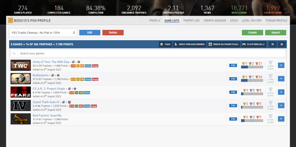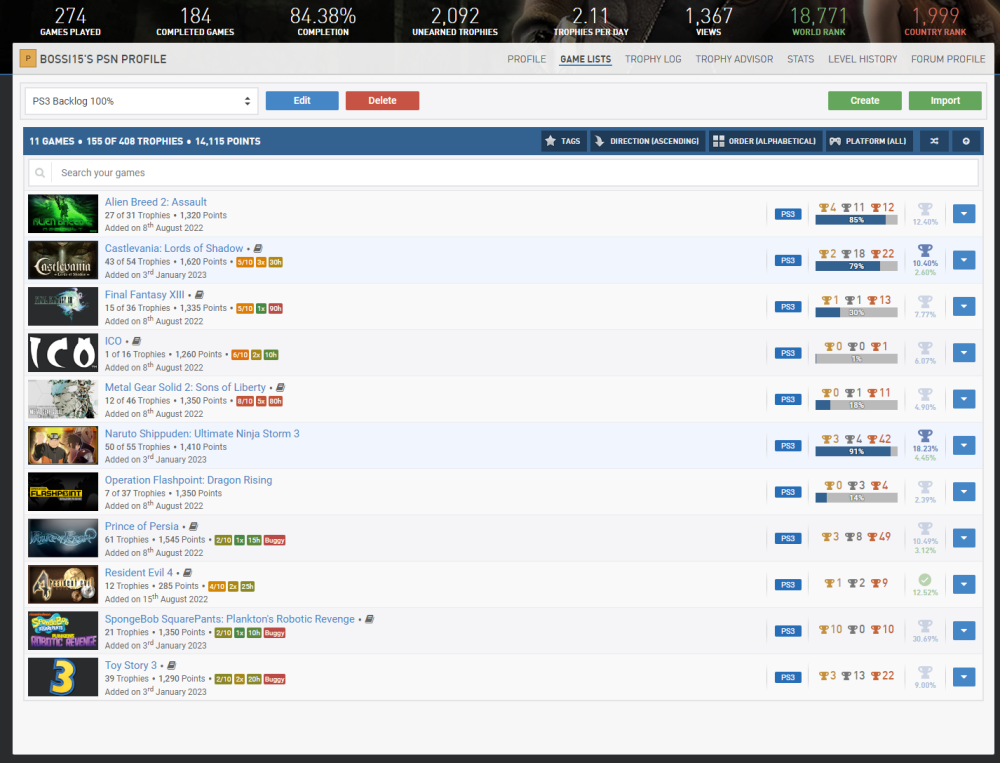 5 Monate sind rum. @Stahllöwe wird schon ganz wuschig. Es wird Zeit fürs nächste Update! Zuletzt aufgehört haben wir bei der Information, dass als nächstes Dead Island Platin und paar Smackdown vs Raw 2011 Trophäen anstehen. Sowie das fantastische 100% Event für das ich mir großes vorgenommen hatte. Also fangen wir mal von vorne an. 1. Dead Island Ich hab das Spiel damals mehrfach angefangen und relativ schnell wieder abgebrochen. Diesmal habe ich es endlich mal durchgezogen und man glaubt es kaum, ich hatte super viel Spaß an dem Spiel. Ich habe nicht nur die Platin gemacht, sondern auch direkt das Arena DLC runtergeladen und das Spiel auf 100% gebracht. Ich hatte ein wenig Glück, denn durch das Online Spielen für die Quests habe ich jemanden gefunden der mir zufällig eine gecheatete AK gedroppt hat. Die habe ich auch für die anderen Charaktere genutzt und somit den Aufwand um mehrere Stunden gekürzt. Ein tolles Spiel, kann man auch heute noch wunderbar spielen, nur der Online Part ist super instabil. Das braucht viele Anläufe bis es endlich mal klappt. 2. Smackdown vs Raw 2011 Leider wusste ich ja schon, dass die Platin nicht mehr möglich ist. Dadurch hat die Motivation deutlich gelitten. Ich habe den %-Satz dennoch auf 71% gepushed. 2 fehlende Offline-Trophäen sind leider verbuggt und müssen in einer Session erspielt werden, dass wurde mir dann zu doof und ich habe es bei der %-Zahl gelassen. Das finde ich aber vollkommen in Ordnung. Ein 100% Profil ist bei mir nicht möglich, die 90% will ich aber dennoch irgendwann gerne sehen. Das sollte auch durchaus möglich sein, aber wir werden mal schauen was da noch so möglich ist. 3. Call of Juarez: Bound in Blood Ich habe eine absolute Love-Hate Relationship mit dem Spiel. Also fangen wir mal beim Guten an, ursprünglich habe ich das Spiel 2010 von einem Freund ausgeliehen und nie durchgespielt. 2021 habe ich die Online-Trophäen geboosted falls ich doch mal Interesse haben sollte. 2022 war es dann soweit. Das Spiel ist klasse, hat eine gute Story und macht insgesamt viel Spaß. Warum also der Hate Part. Ich habe das Ganze kurz vorm Event in Angriff genommen und wollte damit rechtzeitig fertig werden. am 30.08. war ich auch früh morgens mit dem 1. Playthrough fertig und in der folgenden Nacht war auch schon der 2. Playthrough auf dem höchsten Schwierigkeitsgrad (Ziemlich hart meiner Meinung nach) so gut wie fertig. Was ist nun passiert. 3 Kapitel vor Ende des Spiels, sind so ca. 45 Minuten, hat sich die PS3 im Ladescreen aufgehängt. Natürlich kam es wie es sein sollte und der Save war futsch und ich durfte wieder von vorne anfangen. Also nochmal auf Leicht durchspielen um Very Hard freizuschalten und dann nochmal auf Very Hard. Damit habt ihr es nachvollziehbar warum ich es auch hasse. So, dass war alles was vor dem Event ab September an PS3 angefallen ist. (PS4 und PS5 wird auch bald angesprochen) Im Event selber folgten dann noch folgende PS3-Spiele die im Backlog rumsaßen: 4-6: Harry Potter 6, 7.1 und 7.2 Ich bin Riesen Fan von Harry Potter und deshalb auch recht großer Fan der Spiele. ich sag es mal so, schlecht sind sie alle nicht. Kommen aber nicht ansatzweise an die Alten Spiele wie Stein der Weisen und Kammer des Schreckens ran. 7.1 ist wirklich grauenhaft, also da empfehle ich jedem, dass Ganze einfach zu überspringen. Die anderen beiden kann man ruhig spielen. 7: How to Train your Dragon 2 Im letzten Update war ja schon der 1. Teil dran, diesmal ist es der 2.Teil. Wir gehen hier komplett in eine andere Richtung was das Gameplay angeht. Vom Tekken Klon sind wir zu einer Minispiel Sammlung übergesprungen, tut dem SPiel aber nicht viel schlechtes. Für ein Lizenzgame ist es ok. Eine schöne Ultra Rare Platin für die Sammlung. 8: Asuras Wrath Oh Man, was soll ich zu dem Spiel sagen? Es ist absolut fantastisch und von der Inzenierung einfach absoluter Wahnsinn, das sage ich dazu. Das Gameplay geht in eine ähnliche Richtung wie die Naruto Storm Games, also ok Gameplay gemixt mit brillianten Bosskämpfen die durch Quick Time Events absolut fabelhaft in Szene gesetzt werden. Abgerundet wird das Ganze durch eine wunderschöne Tochter-Vater Beziehung die mir im DLC auch das eine oder andere Tränchen in die Augen geschossen hat. Wenn ihr die Möglichkeit habt, gebt dem Spiel eine Chance. Ich verlinke euch mal meinen absoluten Lieblings-Bosskampf aus dem Spiel, der ca. in der Mitte des Spiels stattfindet. Also leichte Spoiler Gefahr. Aber ich saß einfach gebannt vorm Monitor und habe so mitgefiebert wie die beiden sich gegenseitig auf die Fresse geben und das Ganze musikalisch mit der 9.Sinfonie in B-Minor von Beethoven unterlegt ist. Einfach purer Wahnsinn. Für mich das 3. Beste Spiel was ich dieses Jahr gespielt habe. Allein dafür bin ich diesem Backlog-Projekt sehr dankbar. Seid aber bitte gewarnt, die Platin ist nicht einfach und die 100% ist sau schwer, da es ein Street Fighter-DLC gibt und das ist wirklich brutal vom Schwierigkeitsgrad her. 9: Metal Gear Solid 3 Snake Eater Was gibt es zu Metal Gear eigentlich viel zu sagen? Ich liebe die Reihe, habe die Teile 1-3 zum umfallen auf PS1 und PS2 gespielt und so hakelig die Steuerung auch sein mag, sie haben ihren Charme bis heute nicht verloren. Der 3. Teil ist so wunderschön erzählt und so einzigartig durch sein Dschungel-Setting und die Ganzen Dinge die man endecken kann. EInfach ein Must Play für mich. Ein wahres 10/10 Erlebnis. Das war es erstmal mit PS3-Games von denen ich euch erzählen darf. Der Backlog wurde weiter aufgeräumt und gesäubert. Wir nähern uns auch tatsächlich immer mehr dem Ende des PS3-Backlogs zu. Ein Ende ist wahrlich in Sicht, ich haue euch mal 2 Bilder ran, was ich noch auf der Agenda habe. Aktuell wird aber keines davon gespielt. Fokus lag mehr auf PS4/PS5. Ich werde mich aber zeitnah wieder dransetzen und falls erstmal nicht dann berichte ich euch von den anderen Plattformen auch gerne was. 100% geplant sind noch hier: Zum