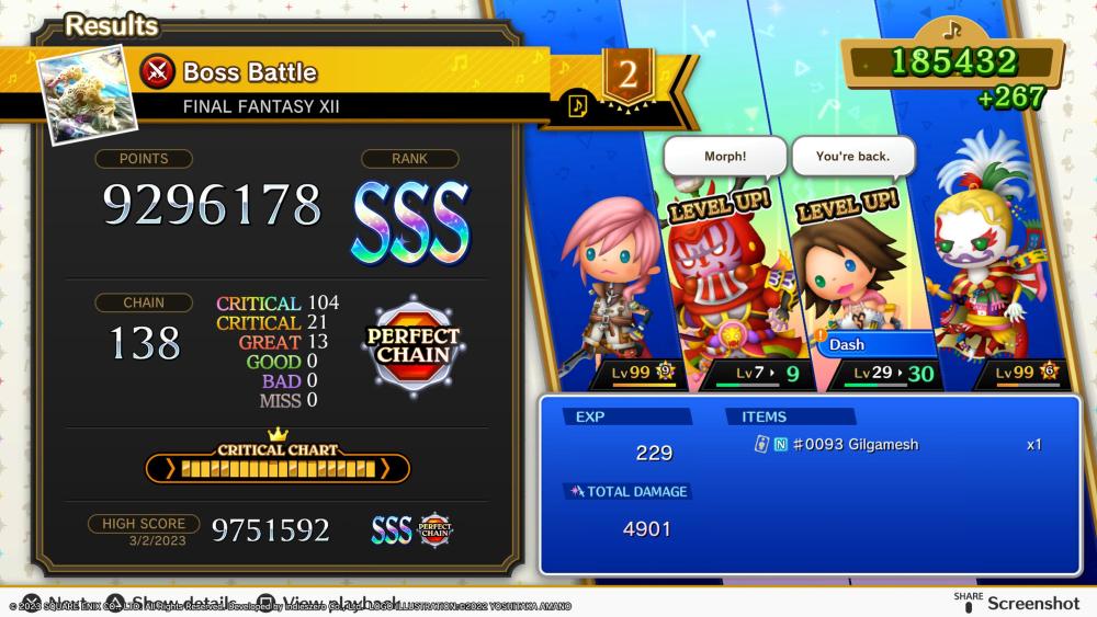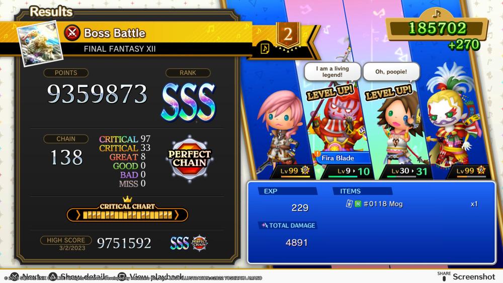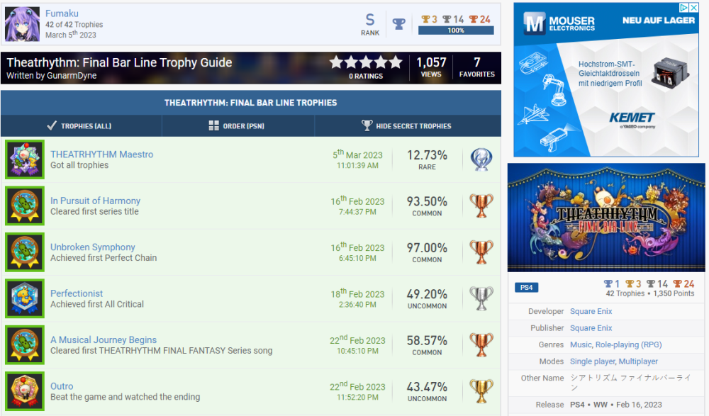 Soo nächste Runde der Trophäenmeldung. Ich habe soeben die Platin in Theatrhythm erworben und würde die für einige Fertigstellungen verwenden wollen. Folgende Trophäen würd ich gerne für Theatrhythm anmelden; Komplettiere ein Spiel mit einer Komplettierungsrate von 05,01% - 24,99% Theatrhythm hat momentan eine Komplettierung von 12,73% Komplettiere ein Spiel mit einer Schwierigkeit von 4,00 - 7,99. Hab das Spiel mit einer 5 bewertet. Komplettiere ein Spiel aus einer Reihe in der du mindestens eine Platin/100% hast. Habe schon einige Final Fantasy Platin erspielt, siehe hier Komplettiere einen Nischen-Titel. Als Music-Titel fällt das hier natürlich auch drunter. Bewerte Spaß, Dauer und Schwierigkeit eines im Event komplettierten Spiels. Bewertungen zu Spaß, Dauer und Schwierigkeit. Erspiele eine Foren-Trophäe aus drei verschiedenen Blöcken. Allein diese eine Platin reicht aus, um diese Trophäe mitzunehmen dank den Blöcken B, V und C Komplettiere ein Spiel für das es keinen Guide gibt. Soweit ich weiß, gibt es immer noch keinen abgeschlossenen Guide und würde diese Trophäe auch mitnehmen. Komplettiere ein Spiel aus der Liste eines anderen Mitspielers. Ich bin mir nicht sicher, aber ich glaube, da @x_jeanne_x das Spiel vor mir abgeschlossen hat und sie Teilnehmerin ist, kann ich es mir erlauben, meine Theatrhythm-Platin für diese Trophäe anzumelden? Bin mir aber nicht sicher. Zu guter letzt möchte ich noch zwei weitere Screenshot-Trophäen anmelden: Beide Screenshots werden unten im Spoiler zu finden sein -