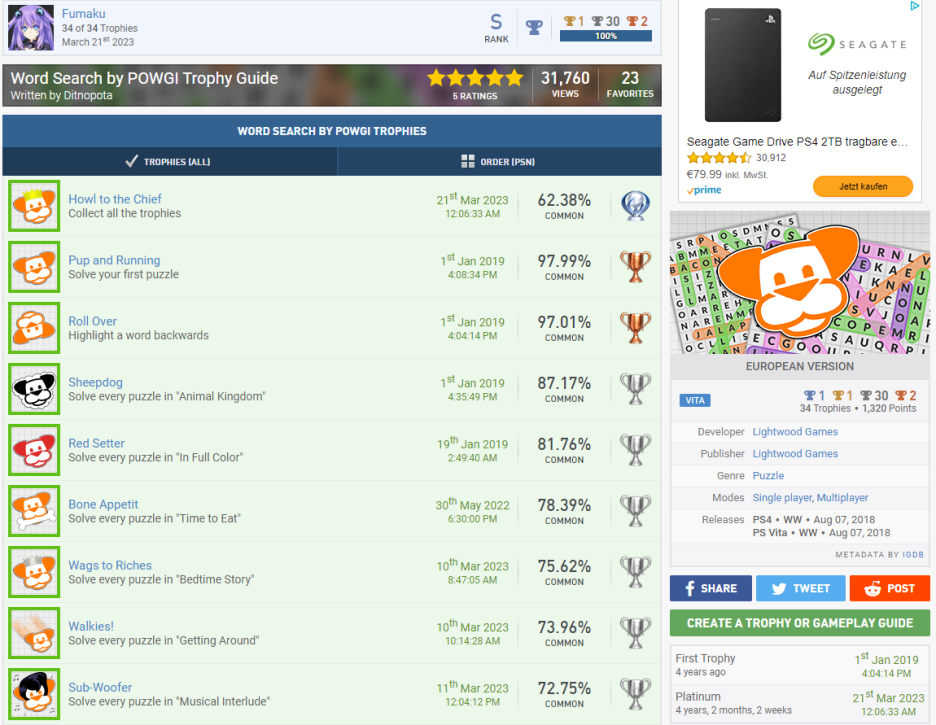 Trophäenmeldung Nr. 7 Eine weitere Platin wurde erspielt um ein paar Trophäen hier zu melden. Das Spiel war Word Search by POWGI und damit will ich folgendes anmelden. Das Spielt hat eine Komplettierungsrate von 62,38% Die Durchschnittsbewertung im Forum liegt bei 2,11 Das Highlight natürlich ist die Tatsache, dass ich dieses Spiel im Jahre 2019 gestartet habe und es damit für diese Trophäe berechtigt ist. Word Search ist bereits das zweite Spiel aus der Powgi-Reihe. MIt dem nächsten Puzzler kann ich auch hier wieder einen Haken dran machen. @x_jeanne_x hat dieses Spiel ebenfalls platiniert. Die hier kann ich tatsächlich auch abhaken: Passenderweise beziehen sich alle Trophäen von Word Search auf den Hund, dementsprechend. Mit meinen drei erspielten Platintrophäen hab ich auch drei unterschiedliche Release-Jahre abgedeckt: Theatrhythm: Final Bar Line erschien 2023 Code Realize: Wintertide Miracles erschien 2019 Word Search by Powgi erschien 2018. Bei meiner letzten Meldung habe ich auch diese bereits abgeschlossen gehabt. Insgesamt bin ich durch diese Meldung bei insgesamt 34 einzigartigen Trophäen angekommen und möchte diese hier damit auch melden. Und sofern alle Trophäen stimmen und ich sie angerechnet bekomme, müsste ich eigentlich auch bei über 1000 Punkten angekommen sein. Yahoo -