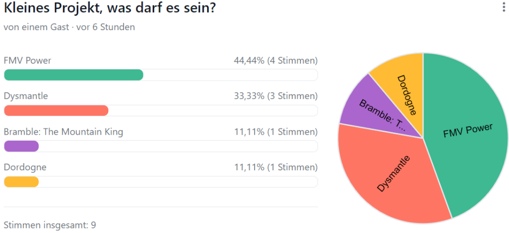 Guten Morgen ihr Lieben, es war mir ein Fest mit euch zusammen endlich mal Demon´s Souls KOMPLETT durchzuspielen. Nicht nur einmal sondern direkt doppelt und die Platin von diesem fantastischen Werk einzuheimsen. Vielen Dank an alle die mit dabei waren, für eure Kommentare und die vielen 5en! Besonderen Dank auch an @Bossi_ für deine Hilfe bei den Tendencies und dem Unterhaltungswert. Das hat viel Freude bereitet. Seit dieser Platin spiel ich aber mal wieder den Platin-Blues... und weiß nicht so recht was darauf folgen kann. Was kann dieses Epos noch steigern? Gute Frage... Wir haben jetzt noch drei Streamtermine die ich gern planen würde. Dann hab ich ein wenig Urlaub und würde mich danach gern in ein weiteres größeres Projekt stürzen. Deswegen heute nur eine kleine Abstimmung über ein kleines Projekt 1. FMV Power: Wir spielen eines der vorgeschlagenen FMV Spiele (sollte das die Mehrheit bekommen, kommt ab 18Uhr eine weitere Abstimmung über den gewünschten Titel) The Bunker (Horror) The Infectious Madness of Doctor Dekker (Murder Mystery) Night Book (Psychological Thriller) Bloodshore (Action Movie) 2. Grusel-Märchen im Little Nightmare Stil. 3. Bunte Farben, wenig Grusel. 4. Alles kleinmachen und überleben mit Zombies und so. (Als reinschnuppern für drei Folgen, mit Option auf mehr, wenn es gefällt) Klick mich zum Abstimmen! @tadini @Bossi_Junior @Vanyar1 @BloodyAngelCherr @DonSchocoLéone @pR00d1gy_ @gnöbli @SquallRB @Tigress @UEG_Phönix @underground9889 @stiller Ich freu mich auf euch und heute Abend -