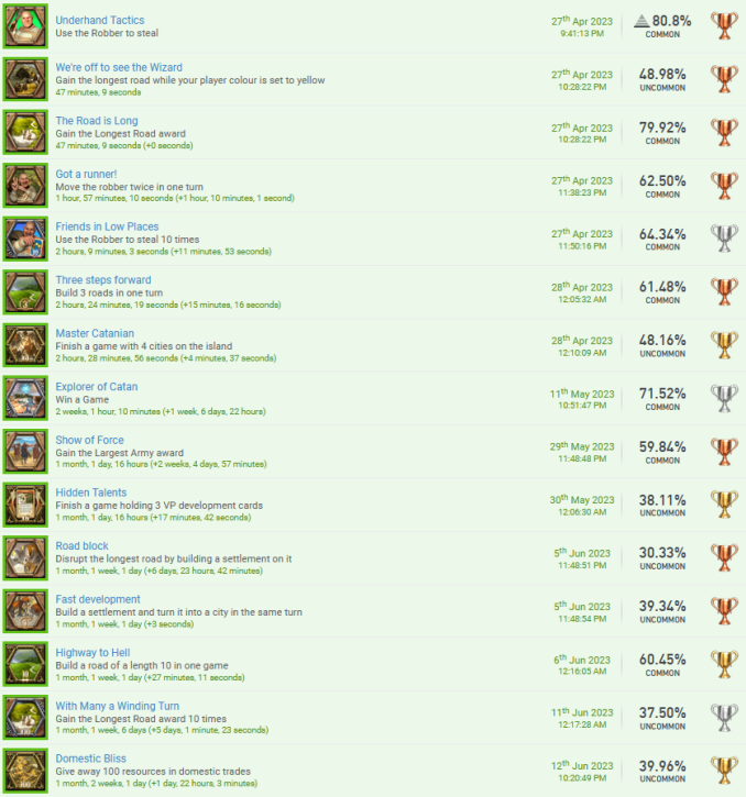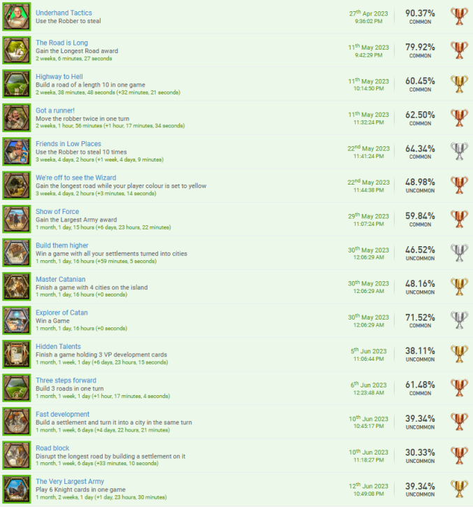 So nach diesem Punkteregen kann eigentlich nichts mehr kommen. Das ist nicht erlaubt! So viele Punkte darf keiner auf einmal melden! also weiter im Text: Für den deutlich schlechteren Brawler gibt es deutlich mehr Punkte...so unfair ist die Welt Brawlout Komplettiere ein Spiel mit einer Komplettierungsrate von 00,00% - 05,00%. Komplettiere ein Spiel mit einer Schwierigkeit von 4,00 - 7,99. Leider gibt es einen Guide für dieses Spiel, welcher aber nach dem letzten Update bewertet. Dort gibt es nun eine Methode die Charaktere auf Level 15 zu boosten und sich damit 100 Stunden zu sparen. Als ich das Spiel gestartet habe gab es das nicht und ich hab nach 50 Stunden aufgegeben. Jetzt mit der Methode ist es möglich aber extrem frustierend. Und die Schwierigkeit kann ich auf keinen Fall so stehen lassen. Man muss den Arcade Mode in drei verschiedenen Schwierigkeitsstufen abschließen ohne ein Leben oder ein Match zu verlieren und das ist mit der unfairen KI extrem heftig. Ich hätte hier locker mit einer 9 bewertet. Komplettiere ein Spiel, was vor 2020 gestartet und bis Eventbeginn nicht beendet wurde. Komplettiere ein Spiel, in dem du mit einem Tier interagierst. Man steuert in diesem Spiel hauptsächlich tierische Kämpfer. Vom Affen-Mönch über den Elektro-Wolf bis hin zum Vier-Arm-Frosch-Wrestler. --------------------------------------------------------------------------------- Landwirtschaftssimulator 15 Komplettiere ein Spiel mit einer Schwierigkeit von 1,00 - 3,99. Komplettiere ein Spiel, in dem du mit einem Tier interagierst. Ich habe leider kein Bild gemacht aber man muss/darf hier ein paar Tiere halten z.B. Schafe --------------------------------------------------------------------------------- Erspielt mindestens zu dritt 10 Trophäen. @stiller, @tadini, @Tomekk20 und ich haben in wechselnder Besetzung (aber immer mindestens zu dritt) Catan gespielt und so einige Trophäen gesammelt. Deshalb hätte ich die Nummer gern gleich 4mal! 15 Trophäen eMTy 15 Trophäen tadini 5 Trophäen Tomekk20 5 Trophäen stiller2010 Stelle eine Platin-Kette bereit. Meine Dredge Platinkette läuft gerade, die liebe @stiller verwaltet sie für mich. Wer noch nicht in dieses charmante Indie-Fischerei Abenteuer reingeschaut hat, kann sich dort, ähm HIER gern anmelden -