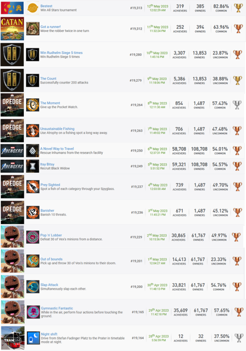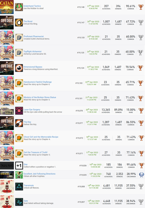 So nachdem mein Thread auch in den Tiefen von Seite 3 verschwunden war, wird es Zeit für neue Fertigmeldungen!!! Und damit es nicht so fad wird, starten wir direkt mit ein paar Geschmacksverstärkern, den sogenannten E´s Erspiele fünf Trophäen die "First/Erster/Start" beinhalten. Die Spiele sind folgende: Cult of the Lamb, Road 96, Islanders Erspiele fünf Trophäen die einen Bezug zu Tieren haben. Die Spiele sind folgende: Cult of the Lamb, Edna & Harvey: The Breakout, Megaquarium DLC, Islanders, Dig Deep Komplettiere drei Spiele mit unterschiedlichen Release Jahren. ---------------------------------------- The Smile Alchemist: 2023 Road 96: 2022 Islanders: 2021 Erspiele 30 Foren-Trophäen. Yeah!! Erledigt Erspiele 30 einzigartige Foren-Trophäen.