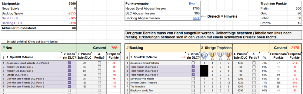 Dann leg ich mal los...es wird natürlich vorsichtig eingesetzt und gar kein Druck aufgebaut...ich hab zur Not noch 60 Punkte übrig... 1. Anmeldung: Assassin´s Creed Valhalla PS5 Backlog 210 Punkte (Rest: 2.790 Punkte) 2. Anmeldung Trials Fusion DLC Pack 2 PS4 Backlog DLC 15 Punkte (Rest: 2.775 Punkte) 3. Anmeldung Trials Fusion DLC Pack 4 PS4 Backlog DLC 15 Punkte (Rest: 2.760 Punkte) 4. Anmeldung Trials Fusion DLC Pack 7 PS4 Backlog DLC 90 Punkte (Rest: 2.670 Punkte) 5. Anmeldung Sayonara Wild Hearts PS4 NA Backlog 315 Punkte (Rest: 2.355 Punkte) 6. Anmeldung Another Crab´s Treasure PS5 Backlog 900 Punkte (Rest: 1.455 Punkte) 7. Anmeldung The Invincible PS5 Backlog 540 Punkte (Rest: 915 Punkte) 8. Anmeldung Blackjack World Tour PS5 Backlog 90 Punkte (Rest: 825 Punkte) 9. Anmeldung Assassin´s Creed Vallhalla DLC Pack 8 PS5 Neu 30 Punkte (Rest: 795 Punkte) 10. Anmeldung Wobbly Life DLC Pack 2 PS4 Neu 45 Punkte (Rest: 750 Punkte) 11. Anmeldung Wobbly Life DLC Pack 3 PS4 Neu 60 Punkte (Rest: 690 Punkte) 12. Anmeldung Dredge DLC Pack 2 PS5 Neu 195 Punkte (Rest: 495 Punkte) 13. Anmeldung Golf with your Friends DLC Pack 3 PS4 Neu 75 Punkte (Rest: 420 Punkte) 14. Anmeldung Golf with your Friends DLC Pack 4 PS4 Neu 180 Punkte (Rest: 240 Punkte) 15. Anmeldung Golf with your Friends DLC Pack 5 PS4 Neu 180 Punkte (Rest: 60 Punkte) oder einfach per link zu meiner Tabelle: https://docs.google.com/spreadsheets/d/1mdqlhUjJrjaLm9uF9H7OABVq0_NmJ6_mxSBEHTFo-U0/edit?usp=sharing -