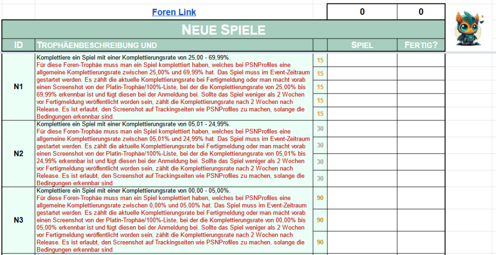 Ja es sind einige Aufgaben die in diesem Jahr erspielt werden können und deutlich mehr Punkte zu holen, da kann man leicht den Überblick verlieren. Deshalb haben wir euch ein Planungsbüro eingerichtet. Ihr könnt den zweiten Post in eurem Thread für eure Planung benutzen und dazu hat unsere IT-Abteilung ( @Tomekk20 ) eifrig an einer wunderbaren Übersicht gebastelt. Über folgenden Link könnt ihr auf diese Tabelle zugreifen: Planer - Bau dir deine eigene Platin 2023 Dort gelangt ihr auf den Bereich Statistik: Dieser füllt sich automatisch mit den Daten die ihr in den einzelnen Blöcken eintragt und soll nicht bearbeitet werden, da hier alle Felder verknüpft sind. Wollt ihr dort ausversehen doch etwas ändern, bekommt ihr eine Meldung. Es sollte also nichts schief gehen können. Der zweite Tab ist die Übersicht. Auch diese füllt sich automatisch mit den Spieletiteln, die ihr in den Blöcken eintragt. Das sollte euch zeigen können wo noch Aufgaben offen sind und wieviel ihr bereits geschafft habt. Und schließlich folgenden die einzelnen Blöcke: Hier seht ihr die einzelnen Foren-Trophäen und deren Beschreibung. In der ersten Zeile ist immer der Foren-Link vorhanden, mit dem ihr in unserer Übersicht zum passenden Block gelangt um vielleicht bei den einzelnen Foren-Trophäen auch noch die Hinweise in den jeweiligen Spoilern zu checken. In dieser Tabelle tragt ihr einfach eure Spiele mit ihrem Titel ein und es werden ganz Oben eure möglichen Punkte berechnet. Solltet ihr das Spiel fertig haben, tragt ihr in die letzte Spalte ein "Ja" ein (es darf auch ein "ja", "JA" oder "jA" sein ) dann werden die anderen Tabellen (Statistik und Übersicht ) mit euren Punkten und Spielen ergänzt und ihr seht wo ihr steht! Wie kommt ihr nun an diese Liste? Dazu gibt es zwei verschiedene Varianten: 1. Ihr habt einen Google Account: Auf den Link gehen: Planer - Bau dir deine eigene Platin 2023 Bei google sich oben rechts anmelden Oben Links auf Datei --> Kopie erstellen klicken Name und Ordner in der eigenen Cloud angeben Kopie erstellen klicken --> Fertig 2. Ihr habt keinen Google Account: Private Nachricht an @da_emty oder @Tomekk20 Die Tabelle wird geklont und eine privater Link erstellt. Diesen erhaltet ihr dann von uns per PN. Der Link sollte nicht weiter gegeben werden, da dieser nicht geschützt ist und jeder Rechte daran hat Daten zu ändern. mit dem Link kann die "persönliche Tabelle" beliebig verändert werden (Link am besten speichern) Solltet ihr noch Fragen oder Wünsche haben, schreibt uns ruhig an. Wir hoffen ihr habt ein wundervolles Event und viel Spaß!- 8 Antworten