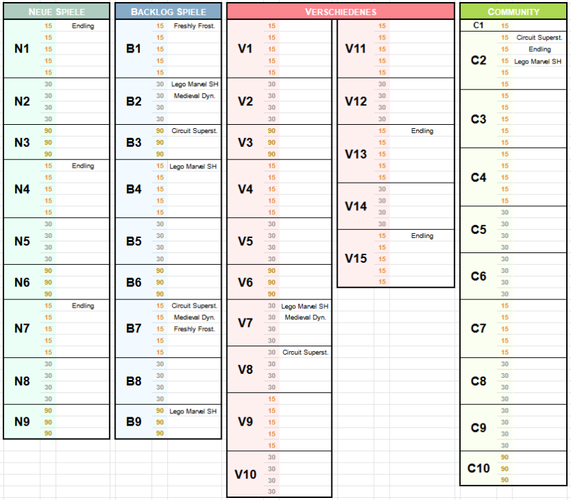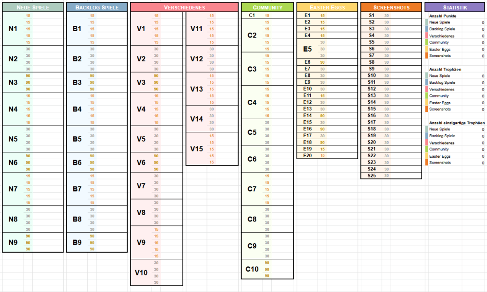 Na klar darfst du dafür auch ein Backlog Spiel nehmen. Bis auf den Block "Neue Spiele" sind alle Blöcke mit Backlog Spielen kombinierbar, es sei denn die Foren-Trophäe sagt explizit etwas anderes. Das kann jeder machen wie er/sie möchte. Du kannst das Bild ja auf der Konsole bearbeiten und schreibst deinen Namen drauf. Oder hat jemand einen anderen/besseren Vorschlag? Die Fragen zielen einfach darauf ab, was ihr euch so vorgenommen habt oder falls jemand in eurem Thread herumstöbert, dass gesehen werden kann was man vielleicht zusammen spielen kann. Nichts davon ist bindend. Ich versteh nicht was du meinst... Es zählt der aktuelle Wert bei der Anmeldung. Es bietet sich an diesen schon anzugeben, wenn man vorhat an ein paar Backlog Sachen zu "arbeiten" bevor es losgeht. Leider nein, wir sind ja kein Pay to win. Du darfst aber bei Twitch auf Follow drücken und sobald möglich einen Prime-Sub dalassen und/oder die 25€ bei buymeacoffee schicken. Und danach die 4.000 Punkte erspielen So es sind für alle Anmeldungen jetzt schon eure Threads freigeschalten. Ihr könnt also dort posten, wenn ihr euch einen Plan machen wollt oder wenn ihr Fragen zu verschiedenen Kombinationen habt oder eure MitspielerInnen anfeuern wollt. Ebenfalls neu ist der "Mitspieler gesucht!" Thread. Dort könnt ihr schonmal gucken ob es Gleichgesinnte für eure Multiplayer-Spiele gibt oder preisgeben wen und für was ihr jemanden sucht. Der liebe @Tomekk20 hat gestern schon eine Tabelle gebastelt, die wir zum Eventstart freigeben und dann kann jeder wieder einsehen wo er/sie steht und welche Punkte bereits erreicht wurden. Vielen Dank dafür!!! Hier ein kleiner Teaser: -