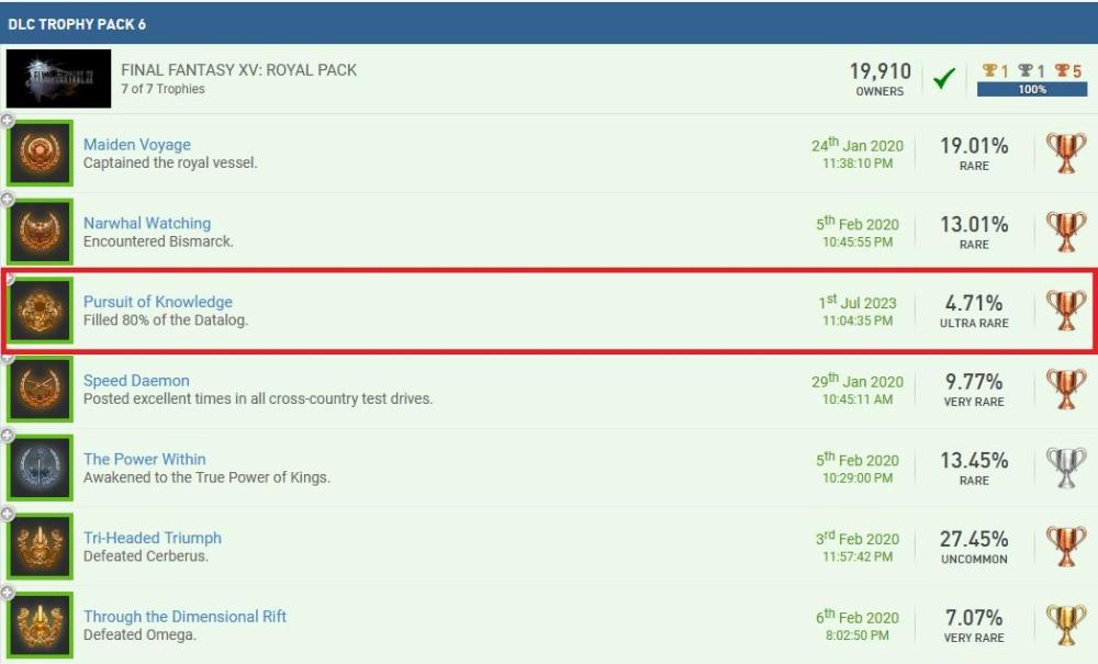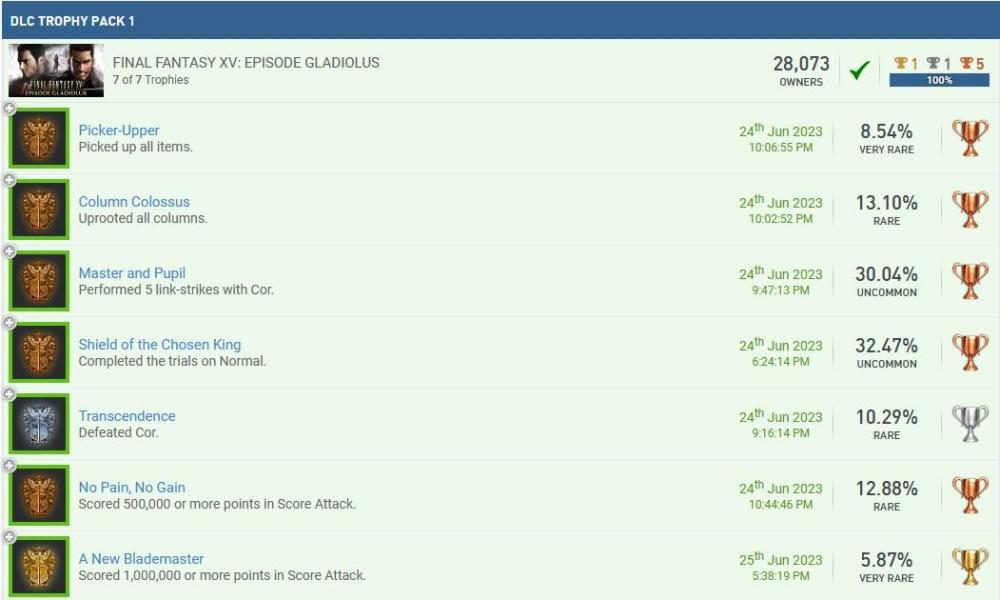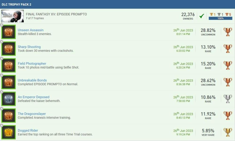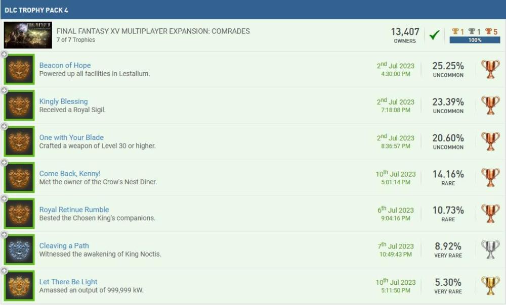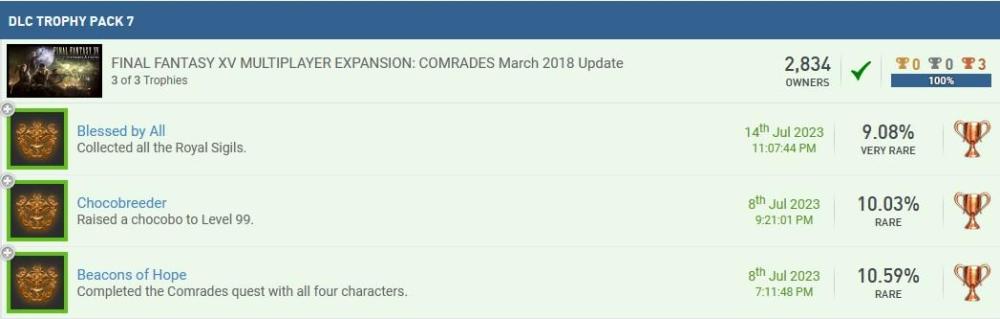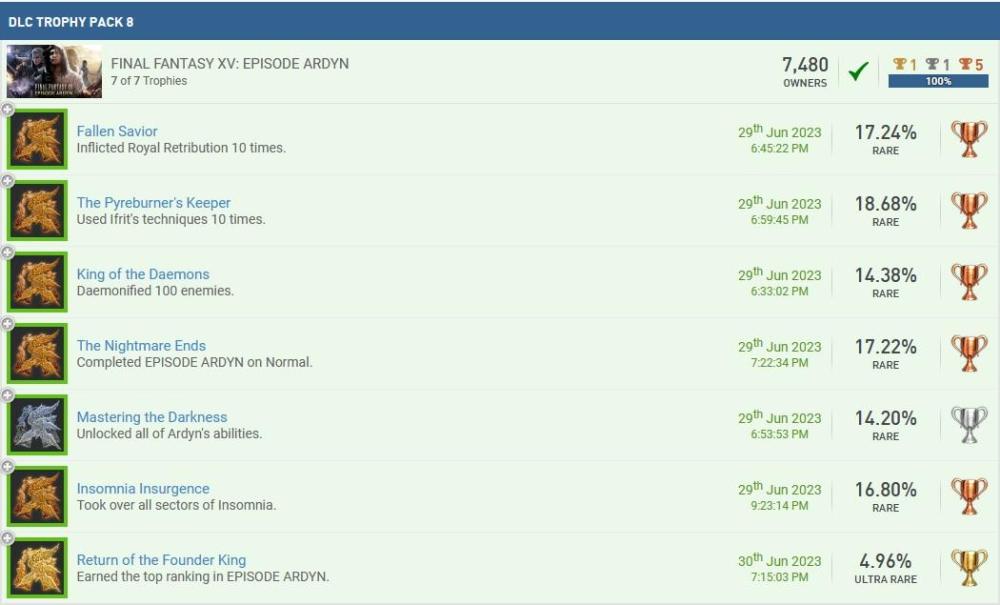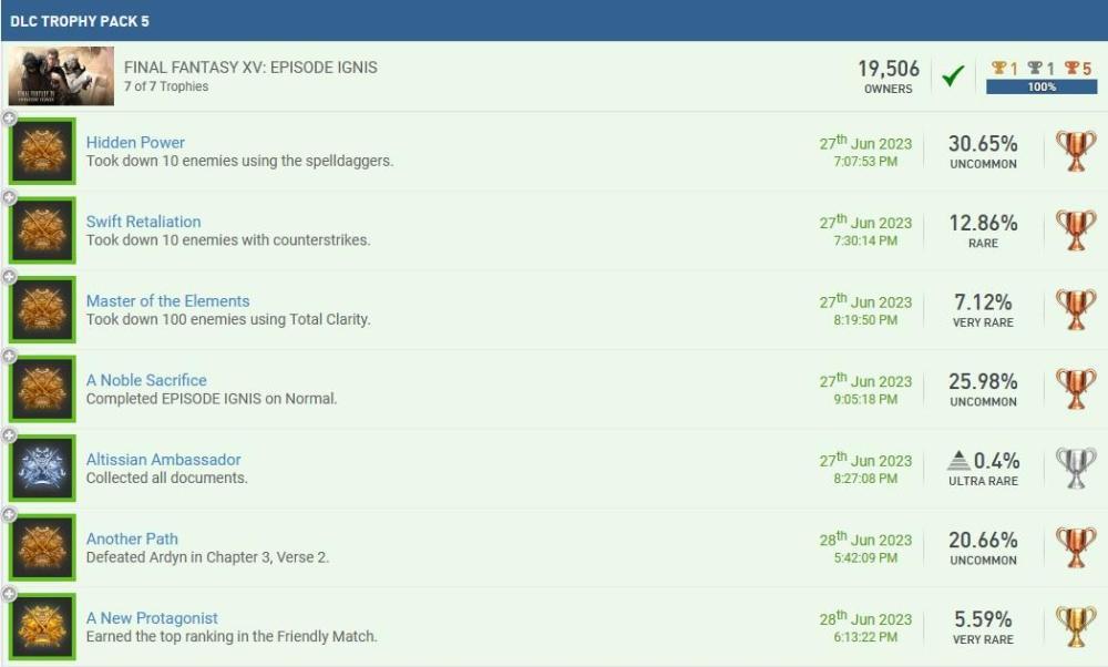 Ich habe endlich die verbliebenen 7(!!!) DLC's von "Final Fantasy XV (PS4)" abgeschlossen und damit folgende Foren-Trophäen erspielen können: 3 X & 2 X Komplettiere ein DLC Pack. Komplettiere 3 DLC Packs in einem Spiel. Bewege drei verschiedene Fahrzeuge. Erreiche in einem Spiel Level 99. Wenn es an den Screenshots nichts auszusetzen gibt, habe ich dann noch die folgende Foren-Trophäe erspielt: Komplettiere einen Block (einfach reicht). Komplettierter Block: "Screenshots" P.S.: Mir ist aufgefallen, dass in meiner Punktetafel ein Eintrag fehlt. Bei N9 müsste noch Code Vein eingetragen werden. Besten Dank und bis zum nächsten Mal. -