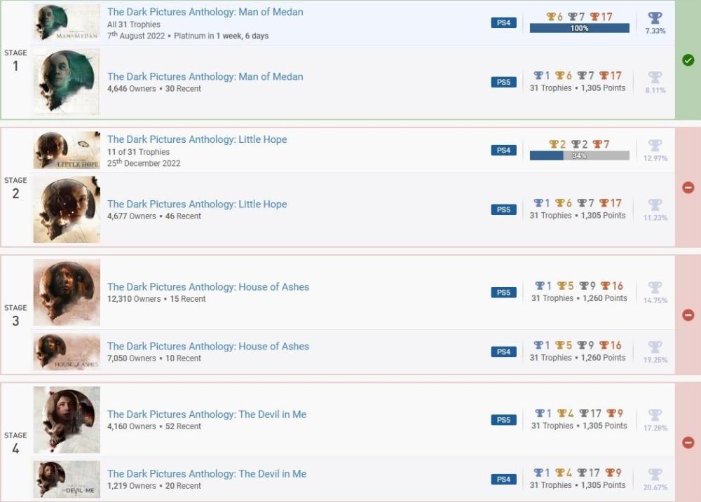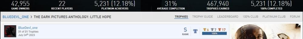 Ich habe das Spiel "The Dark Pictures Anthology: Little Hope (PS4)" abgeschlossen und damit folgende Foren-Trophäen erspielen können: Komplettiere ein Spiel mit einer Komplettierungsrate von 05,01% - 24,99%. Komplettiere ein Spiel mit einer Schwierigkeit von 1,00 - 3,99. Komplettiere ein Spiel, das 2022 gestartet und bis Eventbeginn nicht beendet wurde. Komplettiere ein Spiel aus einer Reihe in der du mindestens eine Platin/100% hast. Bewerte Spaß, Dauer und Schwierigkeit eines im Event komplettierten Spiels. -