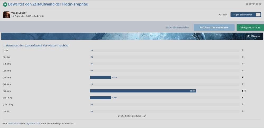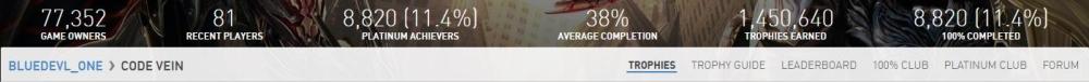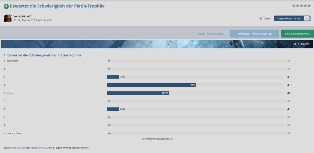 Ich habe das Spiel "Code Vein (PS4)" abgeschlossen und damit folgende Foren-Trophäen erspielen können: Komplettiere ein Spiel mit einer Komplettierungsrate von 05,01 - 24,99%. Komplettiere ein Spiel mit einer Schwierigkeit von 4,00 - 7,99. Komplettiere ein Spiel mit einer Spielzeit von über 40 Stunden. Schaffe einen Spieldurchgang auf einem schweren Schwierigkeitsgrad oder NG+ Bewerte Spaß, Dauer und Schwierigkeit eines im Event komplettierten Spiels. -