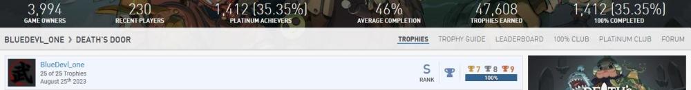 Ich habe das Spiel "Death's Door (PS4)" abgeschlossen und damit folgende Foren-Trophäen erspielen können: Komplettiere ein Spiel mit einer Komplettierungsrate von 25,00 - 69,99%. Komplettiere ein Spiel mit einer Schwierigkeit von 4,00 - 7,99. Komplettiere ein Spiel mit einer Spielzeit von 4,00 - 19,99 Stunden. + Komplettiere einen Indie-Titel. Komplettiere einen Nischen-Titel. Komplettiere ein Spiel, in dem du mit einem Tier interagierst. Bewerte Spaß, Dauer und Schwierigkeit eines im Event komplettierten Spiels. Komplettiere drei Spiele mit gleichen Release Jahren. -