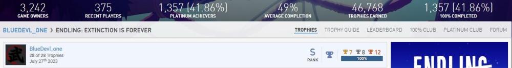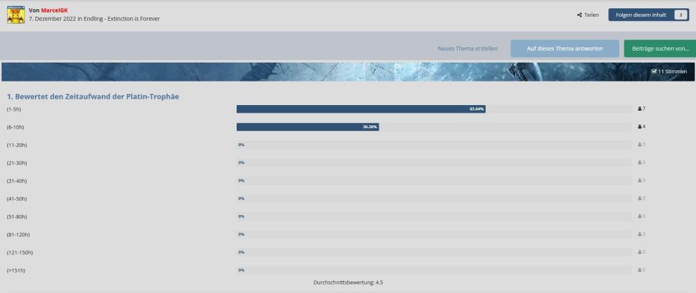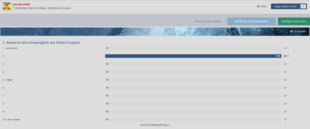 Ich habe das Spiel "Endling: Extinction is Forever (PS4)" abgeschlossen und damit folgende Foren-Trophäen erspielen können: Komplettiere ein Spiel mit einer Komplettierungsrate von 25,00 - 69,99%. Komplettiere ein Spiel mit einer Schwierigkeit von 1,00 - 3,99. Komplettiere ein Spiel mit einer Spielzeit von 4,00 - 19,99 Stunden. Komplettiere einen Indie-Titel. Komplettiere ein Spiel, in dem du mit einem Tier interagierst. Bewerte Spaß, Dauer und Schwierigkeit eines im Event komplettierten Spiels. Komplettiere ein Spiel des Monats. Zusätzlich habe ich die folgenden Foren-Trophäen erspielen können: Erspiele fünf Trophäen zum Thema: Familie. Erspiele fünf Trophäen die einen Bezug zu Tieren haben. Erspiele für jeden Buchstaben eine Trophäe. Wenn meine Berechnungen richtig sind, dürfte ich damit nun 2925 Punkte erspielt haben. Das heißt, ich müsste nur noch meine Komplettierungsrate halten und hätte dann mein angestrebtes Ziel von "vielleicht Gold" erreicht. Auf der anderen Seite ist in einem Monat noch einiges möglich, vielleicht sogar 1.000 Punkte...? -