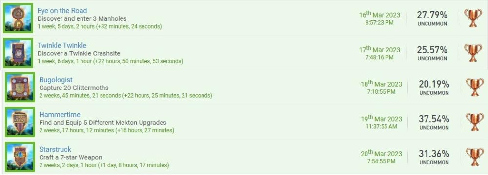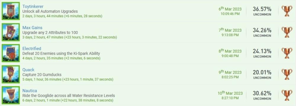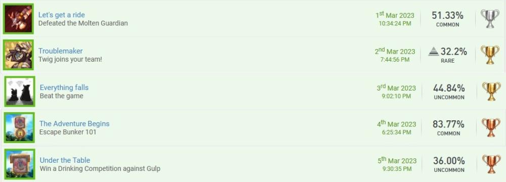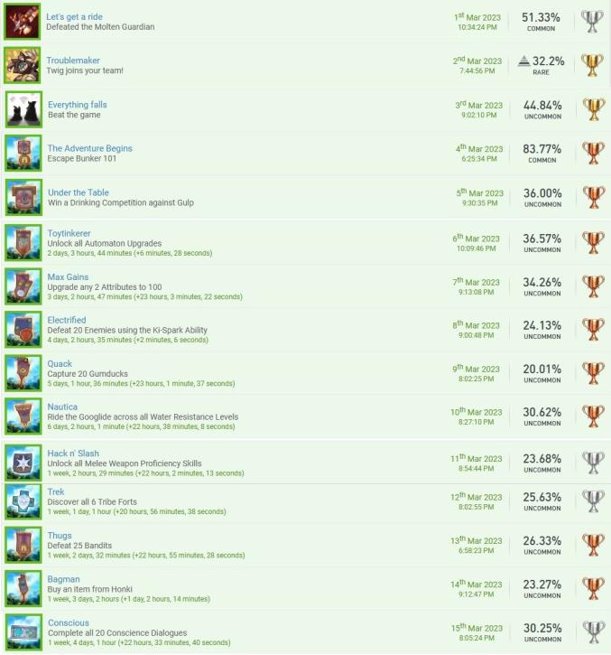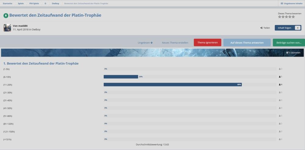BlueDevls Reise zur Foren-Platin 2023BlueDevl antwortete auf BlueDevl's Thema in: Bau dir deine eigene Platin 2023 Da bin ich wieder und möchte folgende Foren-Trophäen als abgeschlossen melden: 4 X Erspiele an fünf aufeinanderfolgenden Tagen mindestens eine Trophäe. Erspiele an 15 aufeinanderfolgenden Tagen mindestens eine Trophäe. Des Weiteren ist mir beim Durchschauen meiner Punktetafel aufgefallen, dass die Foren-Trophäen C2 und S25 nicht eingetragen wurden. Beide hatte ich mit dem Spiel "Owlboy" erspielt.